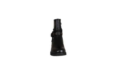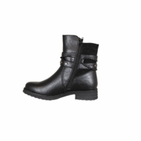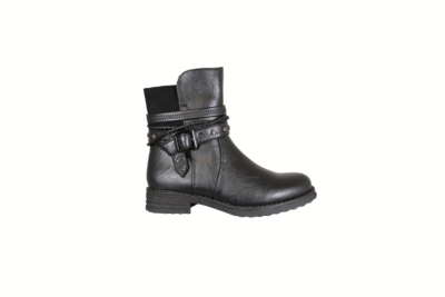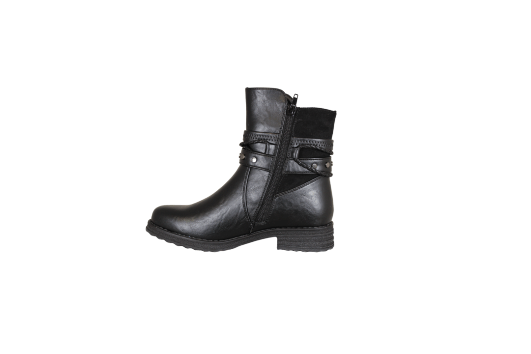 5TH AVENUE 2551-22 SORT (524-2996). Sort støvle med en masse fine detaljer. Støvlen er lavet i vegansk materiale, og foret med tekstil indvendig. På siden af støvlen er der både smalle og bredde samt, samt en guld spænde. På indvendig side er der en lynlås, så den er nem at tage af og på.