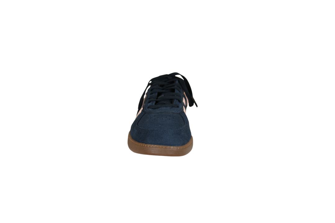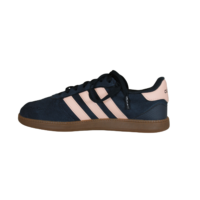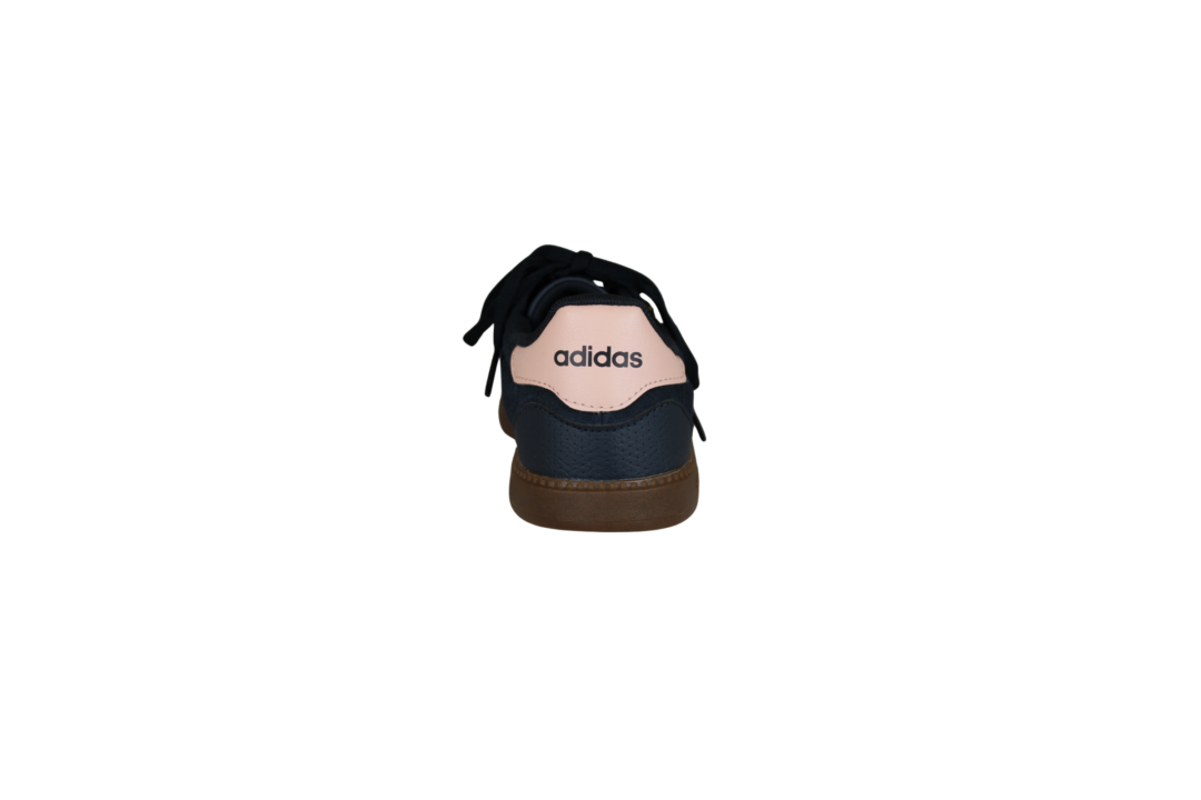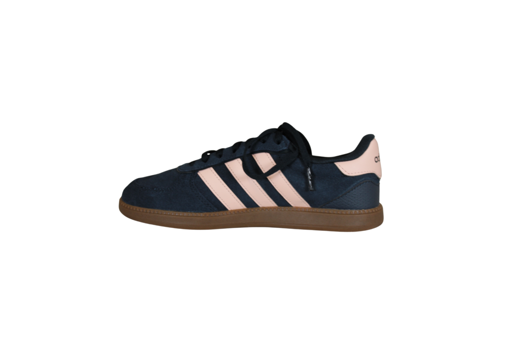ADIDAS JR6906 BREAKNET SLEEK (741-3629). Mørke blå sneakers fra ADIDAS med sarte lyserøde striber på siden, og sart lyserød detalje ved hælkappen. Skoen er lavet i skind (ruskind) udvendig, og foret med tekstil indvendig. Indvendig sål er foam plus, hvilket gør den lækker blød at gå på. Ydersålen er lavet af gummi i en brun farve. Passer til det meste i gaderoben.