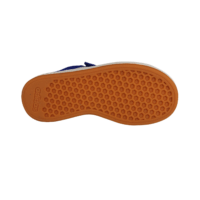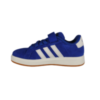 ADIDAS JH6180 GRAND COURT 00s EL C (741-3616). Flot blå kondisko med 3 hvide striber på ydersiden. Materialet er skind (ruskind) udvendig, og foret med tekstil indvendig. Nem for barnet selv at tage på med det yderste velcrobånd hen over vristen. Ydersålen er lavet i gummi – nederste del er i brunt gummi.