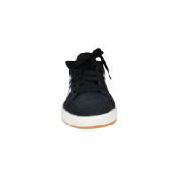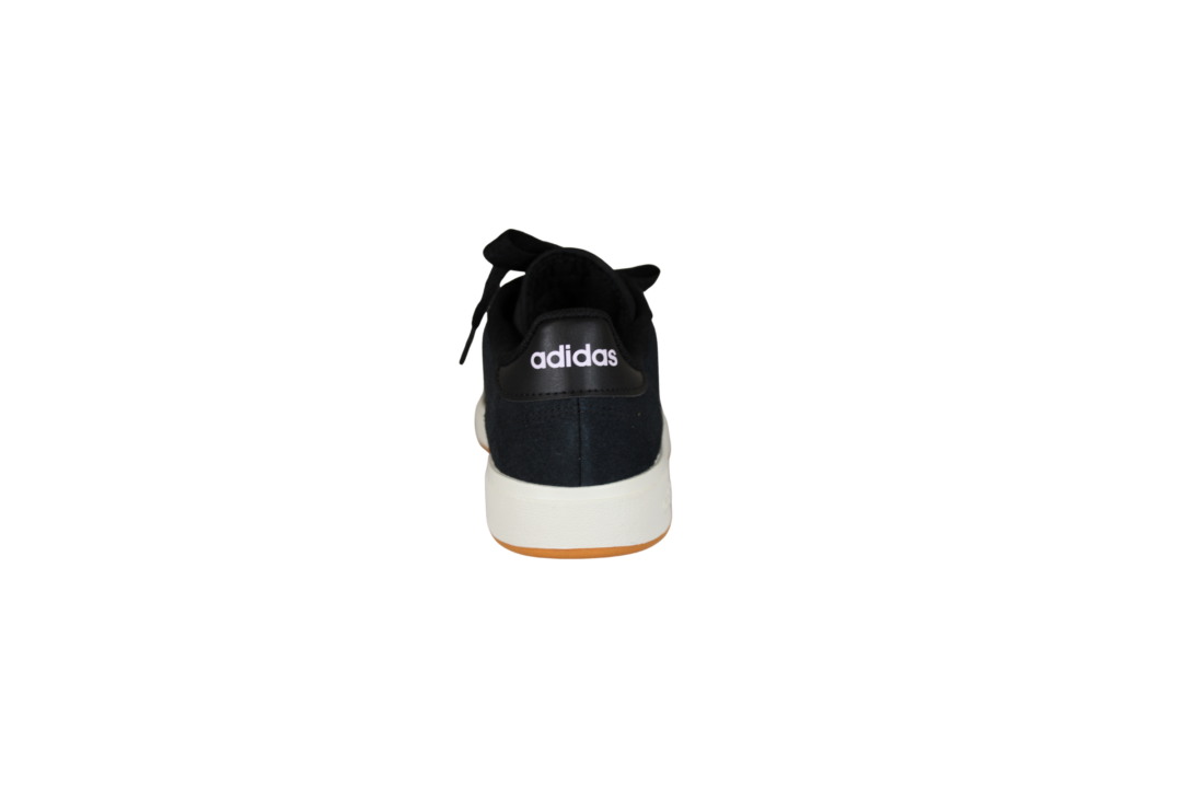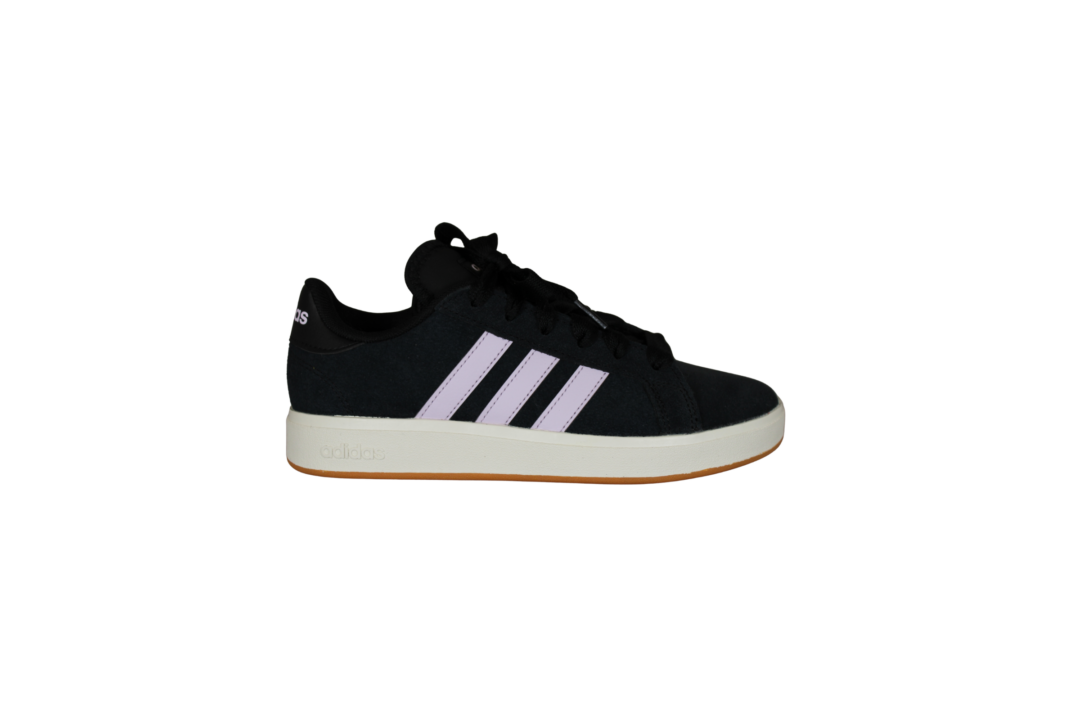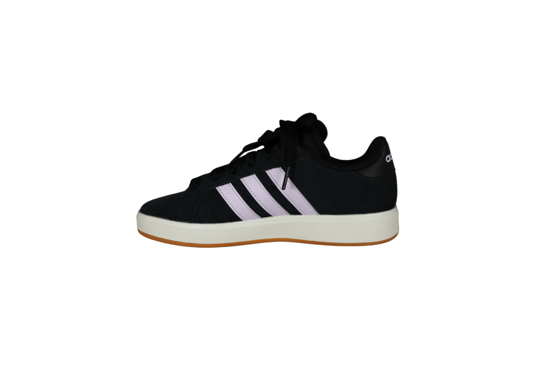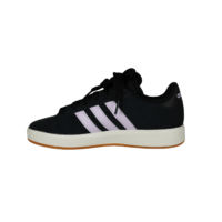 ADIDAS JQ3596 GRAND COURT BASE 00S (741-3623). Sort sneakers med Adidas med lyserøde striber på siden. Skoen er lavet i skind (ruskind) udvendig, og foret med tekstil indvendig. Snørebåndet er breddere end normalt, men giver et smartere look. Sålen er hvid med gul gummisål helt under sålen.