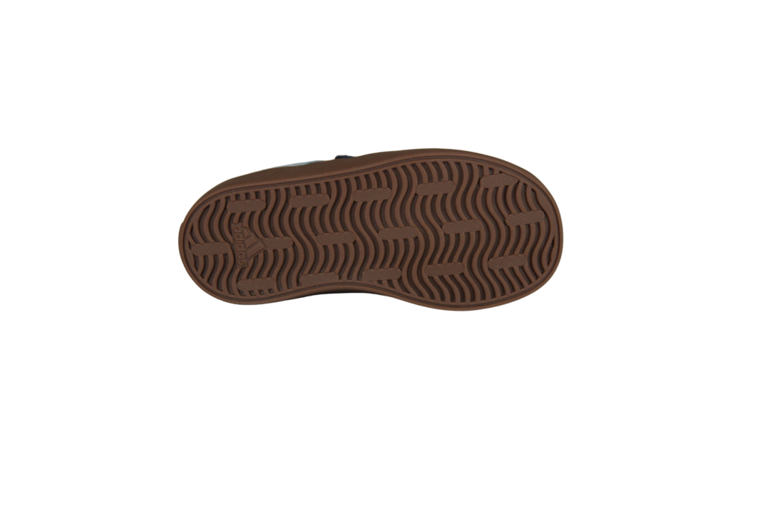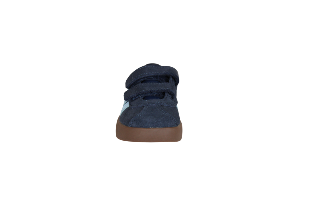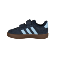 ADIDAS KI6491 VL COURT 3.0 CFI (741-3625). Mørkeblå sneakers med lyseblå detaljer på striber og hæl. Sålen er mørkebrun. Yder materialet er en blanding af skind og vegansk materiale. Nem selv for barnet at tage på, ved hjælp af de 2 velcrobånd.