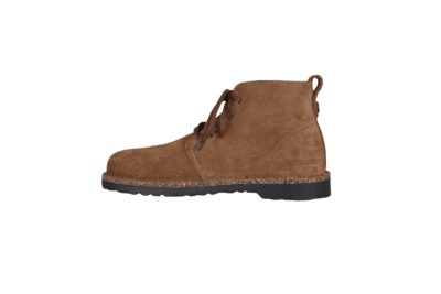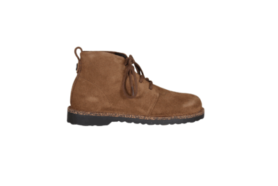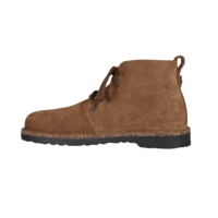 Ankelkort støvle i brun fra Birkenstock. Støvlens overdel er lavet i ruskind, og har snørebånd op langs vristen så den sidder godt fast til foden. Støvlen har en god støttende sål. Slidsålen er lavet i mørkebrun gummi. Modellen er smal vidde.