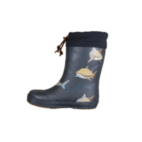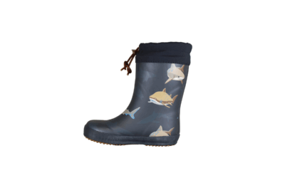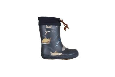 BISGAARD THERMO 92009.999.9026 DEEP BLUE SHARK (861-0116). Mørkeblå termo støvle med hajer fra BISGAARD. Gummistøvlen er lavet i gummi. Støvlen med uld foer, hvilket har en god varme. Sålen er foret på den ene side, og bagpå er der termo. Rundt i skaftet er der et læderbånd, der kan justeres.