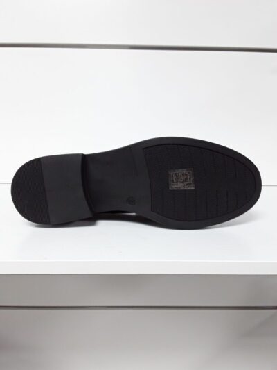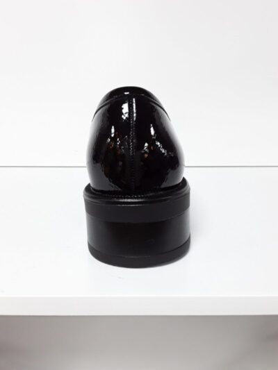 BLACK VEGAN 33113027-01604. Klassisk hyttesko med en lille plateau bund (hæl er 3,5 cm og under forfod 1,5 cm) i sort lak. Smart til festlige tider, og hvis man ikke er til højhælede. Materialet er vegansk både ind- og udvendig, men kan sagtens holdes pæn.