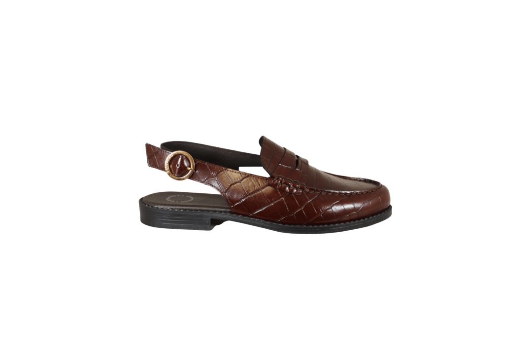 CA´SHOTT CASROBERTA LOAFER CROCO 61252545 (031-574). Flot mørkebrun slingback i croco skind. Indersålerne er polstret og er i skind, så de er gode bløde at gå med. Bag remmen kan reguleres, så skoen sidder godt på foden, med et lille guld spænde. Ydersålen er en gummisål, så den er blød at gå med. En rigtig smart sko til de bredde bukser eller til kjolerne.