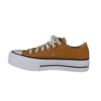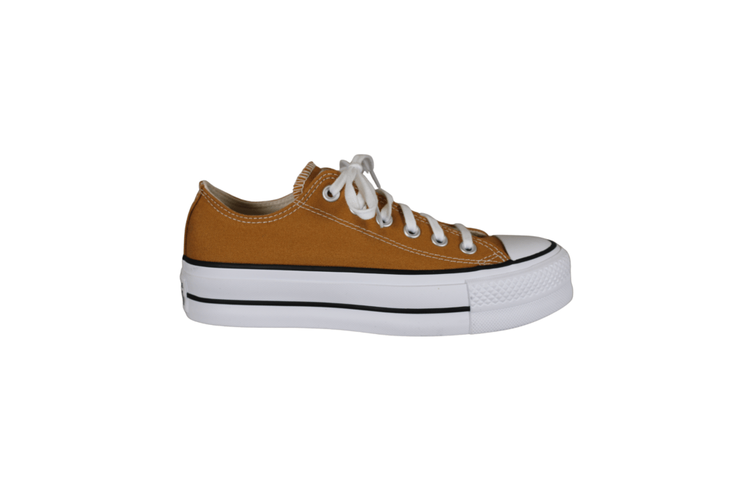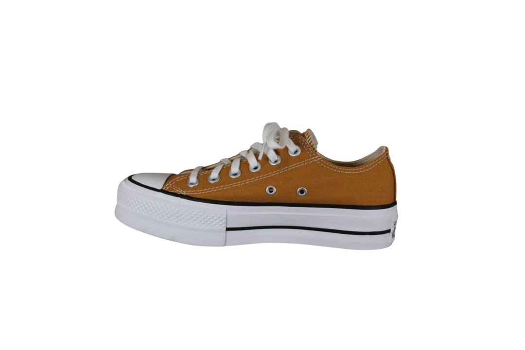 CONVERSE A16106C CTAS LIFT OX (741-3734). Smart brandt gul lærredssko. Indersålerne er er polstret, så skoene er bløde at gå med. Ydersålerne er Converse´s plateau hvide sål med den sorte streg og Converse logo på hælen, en gummi forstækning på tåen. Logoet er ligeledes på hælen og på pløjsen. Lange hvide snørebånd. En god sko til daglig brug, passer til det meste i gaderoben.