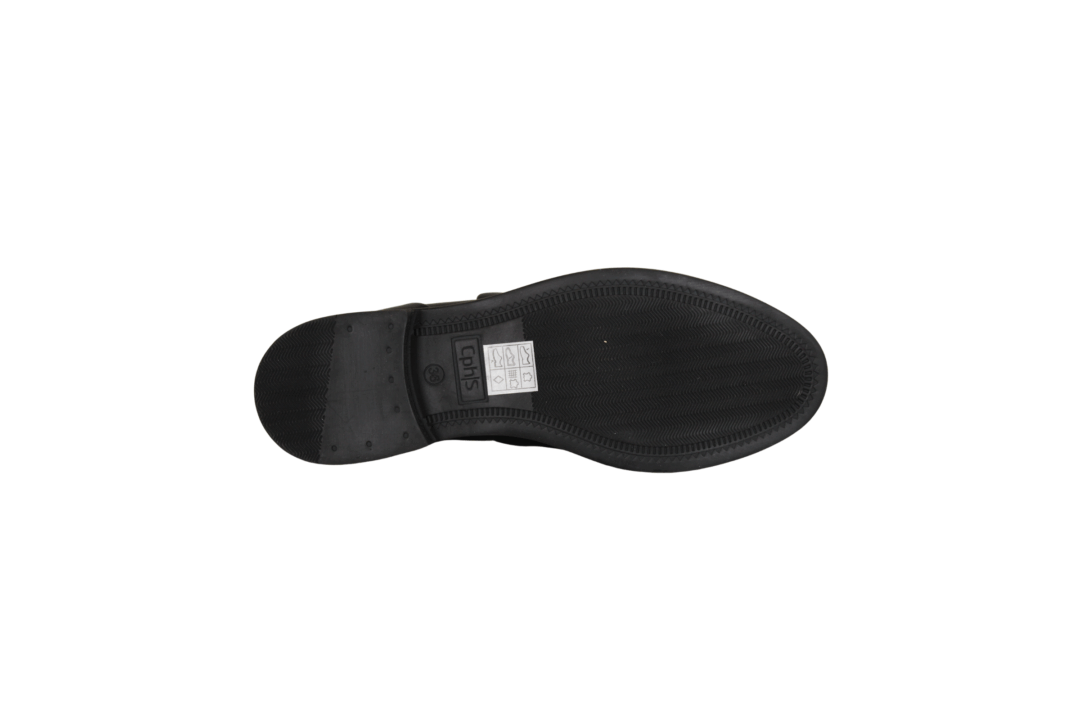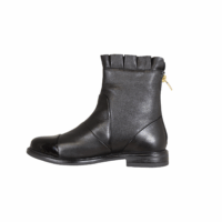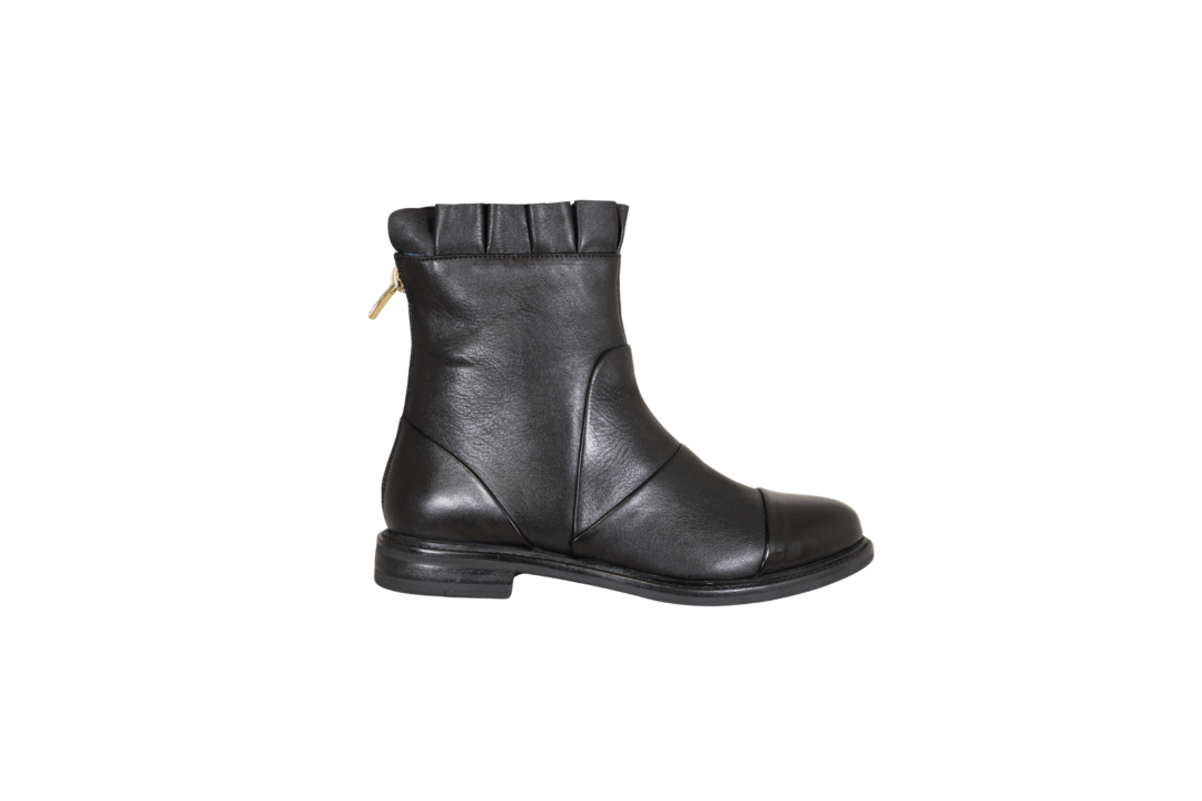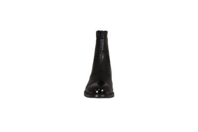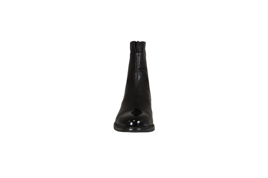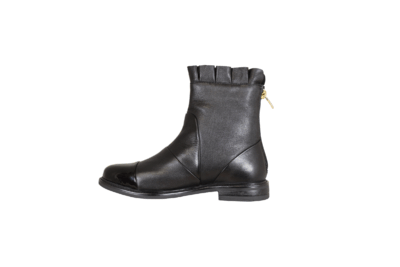COPENHAGEN SHOES CS7789 BLACK/PATENT MARGARET (524-2778). Sort støvlet med flæsekant i toppen af støvlen samt lak snude. Bag på støvlen sidder en lynlås, som skal bruges for at få støvlen af og på. Støvlen er i læder, som kan vedligeholdes pænt. Sålerne er den klassiske tynde sål.