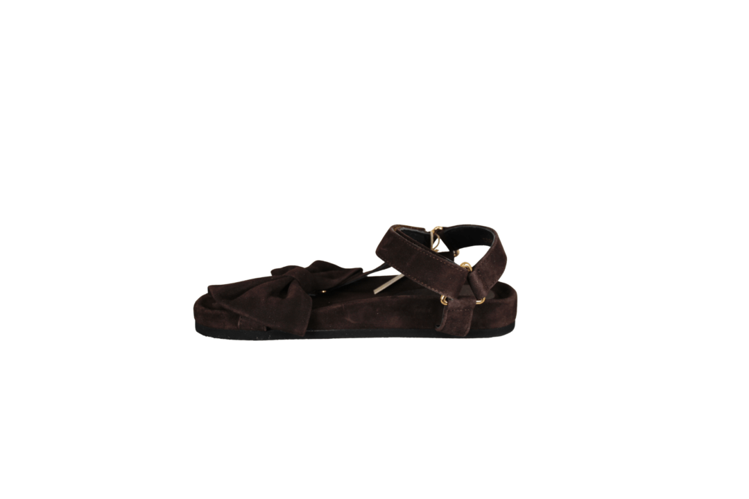 Sandal til damerne fra Copenhagen Shoes i mørkebrun. Sandalen har en sløjfe ude over forfoden. Sandalen har en justerbar velcrorem, så den kan spændes fast til foden. Den indvendige sål er dækket i ruskind og det gælder også for resten af det indvendige af sandalen. slidsålen er lavet af sort PU. Super sød sandal til forskellige begivenheder.