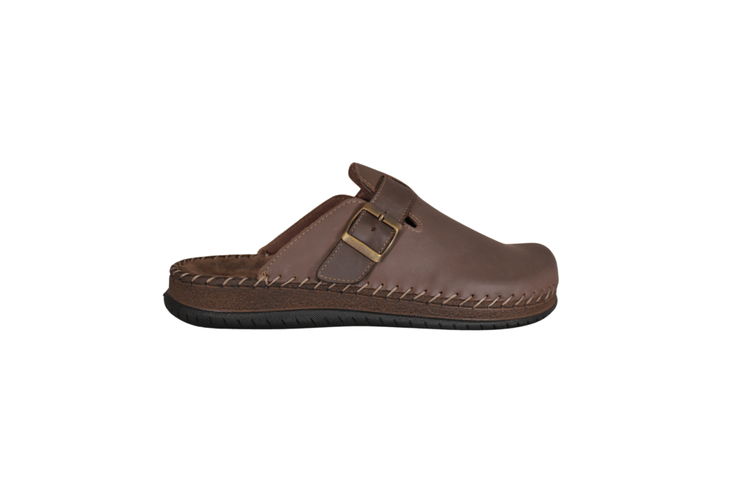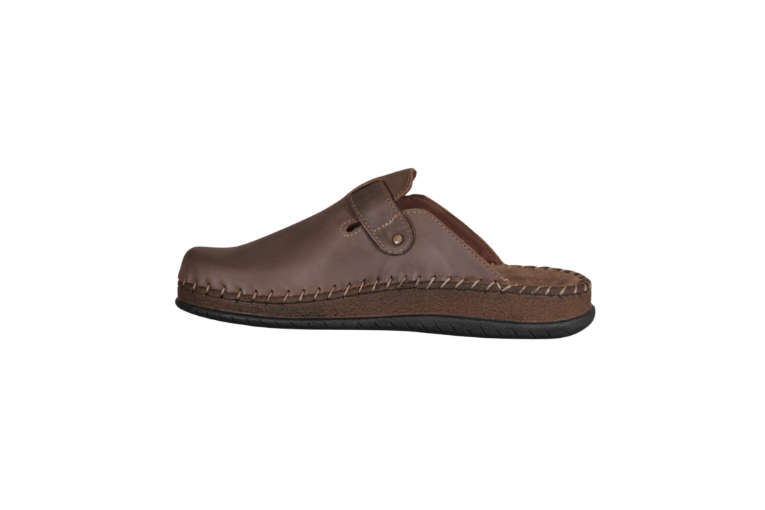 COPENHAGEN SHOES CSM2138 SAN JOSE LEATHER 135 BROWN (027-502). Brun herre hjemmesko med praktisk læderoverflade – kan vedligeholdes med læderbalsam eller skocreme. Skoen er lavet i skind, både ind- og udvendig. Ydersålen er lavet af gummi. Hen over vristen er der en rem, du kan spænde til og fra vristen.