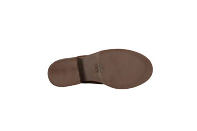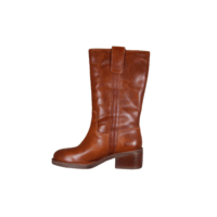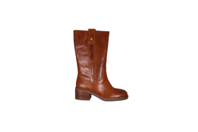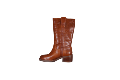 Mellem lang cognac farvet skindstøvle. Skaftet er 26,5cm høj, og med fine syninger rundt omkring. Indvendig er støvlen foret med skind og har en skind dæksål. Slidsålen er en brun gummisål. Støvlen har en hæl på 5,5cm.