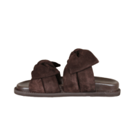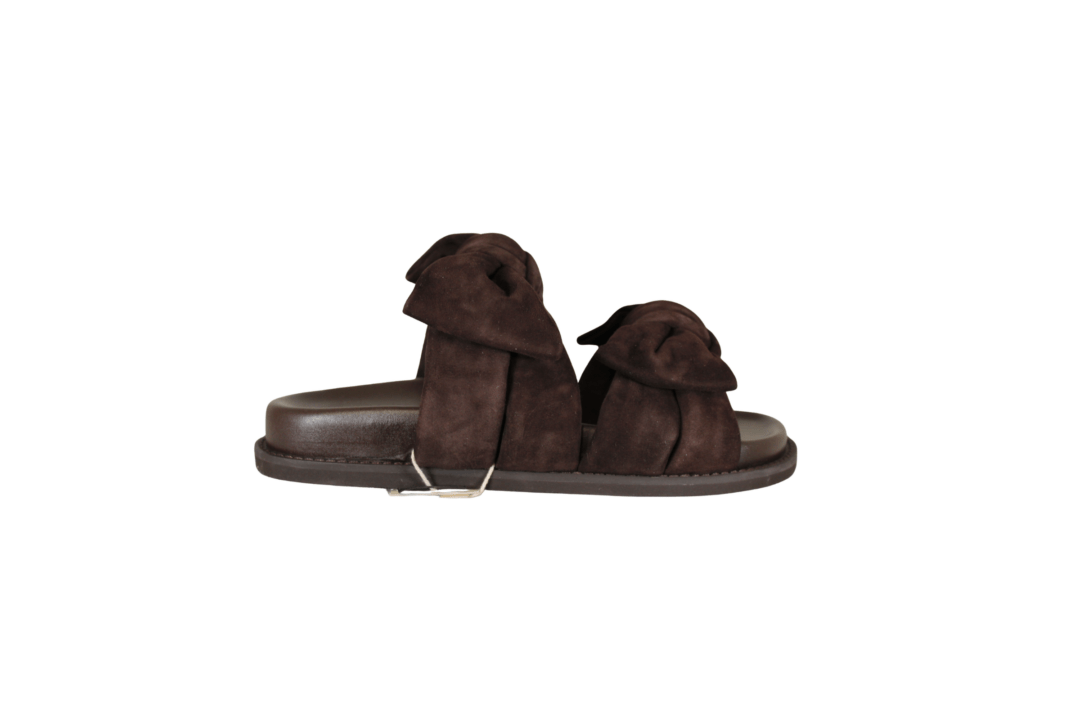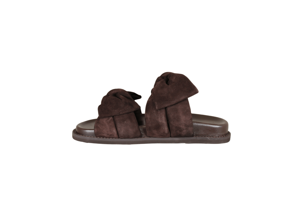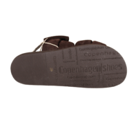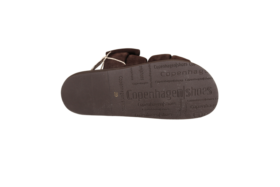 COPENHAGEN SHOES SUMMER DREAM SUEDE CS8399 0012 BROWN (442-1716). Mørkebrun slenters med 2 sløjfer hen over foden. Materialet er skind både ind- og udvendig samt dæksålen, hvilket giver en god åndbarhed for foden. Fodskålen giver god støtte til både svang og forfod. Slidsålen er lavet i gummi.