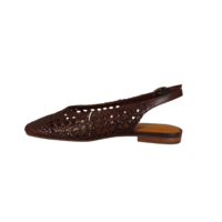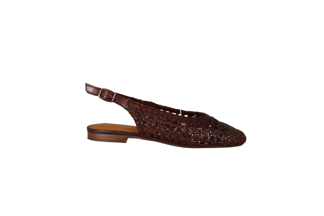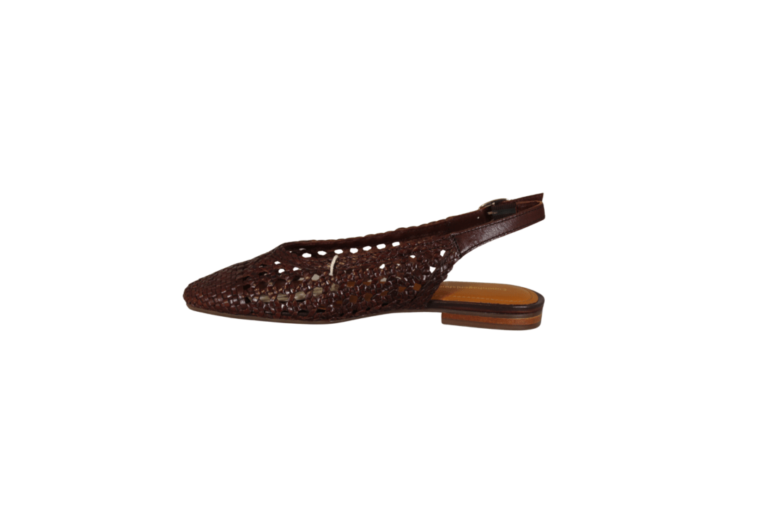 COPENHAGEN SHOES VALERIE CS8901 0018 BK BROWN (221-2161). Let sommersko fra COPENHAGEN SHOES med hul mønster. Materialet er flettet skind der er gennemgående, samt dæksålen er skind. Hælkappen er sling back, der kan justeres med en guld spænde. Slidsålen er lavet i hårdt gummi.