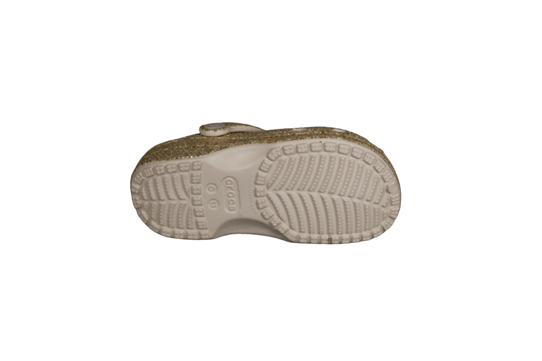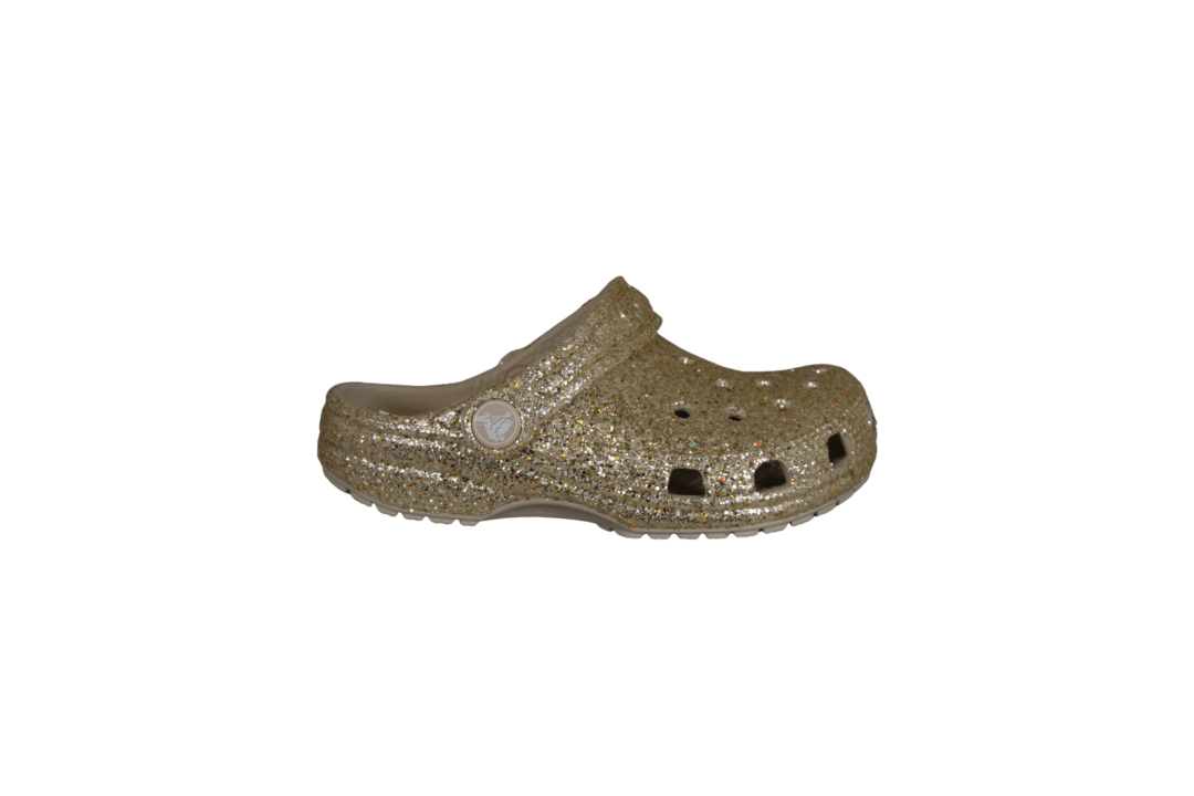 Den helt klassiske CROCS med guld glimmer til pigerne. Remmen kan tages tilbage og bruges som bagrem. Hurtig og nem at smutte i, når det skal gå stærkt eller gode ved stranden og legepladsen.