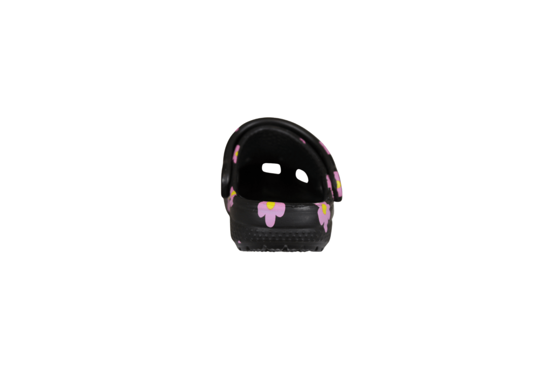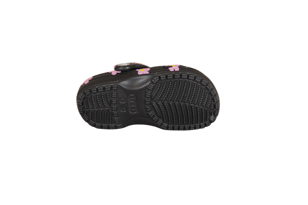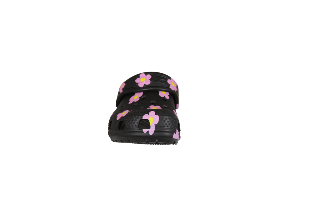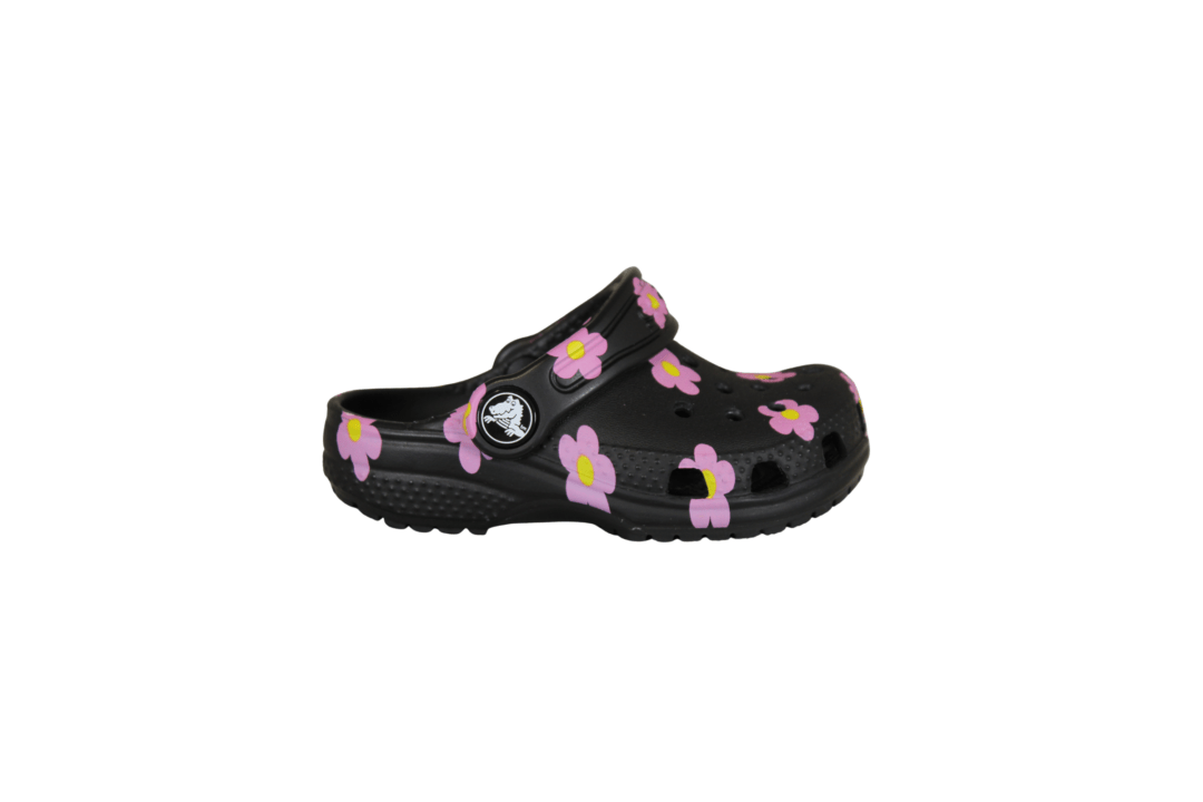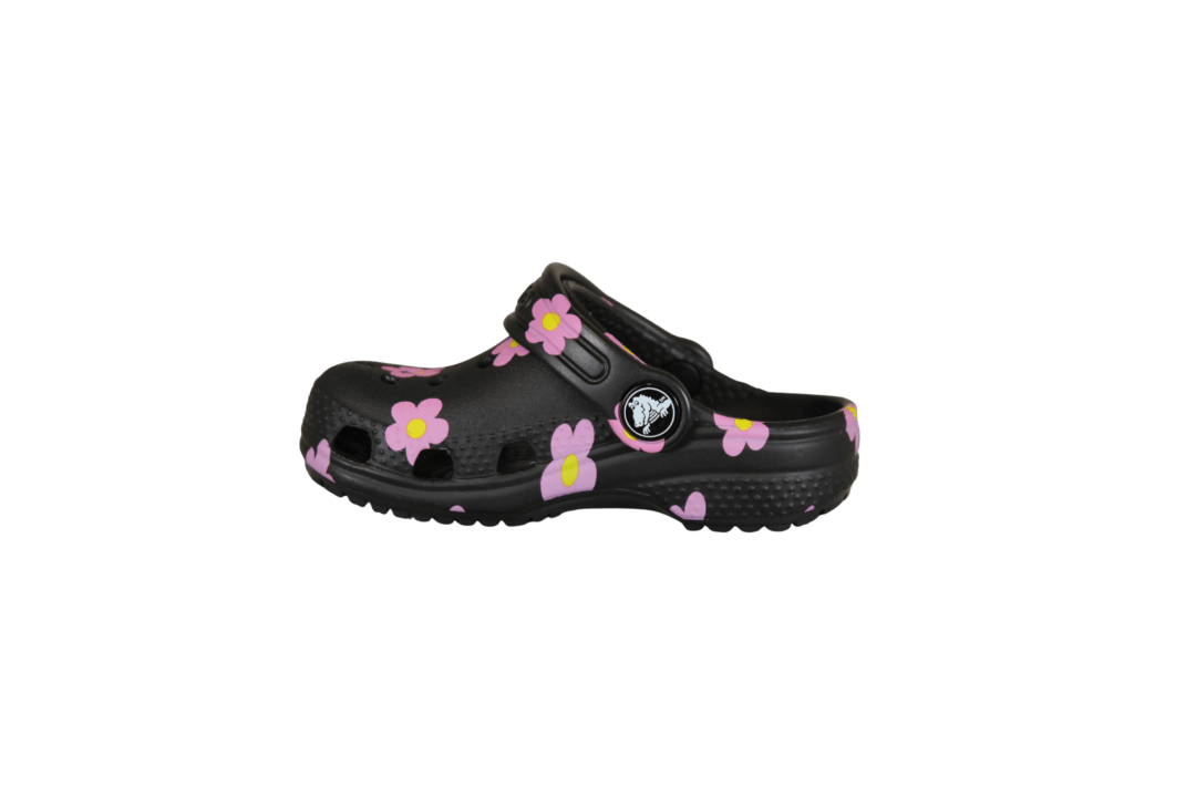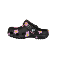 CROCS 212670-001 CLASSIC FLOWER CLOG (087-379). Crocs til børn med lyserøde blomster. Træskoen er lavet i ren gummi, som er blød at gå på. Hen over vristen sidder en rem, der også kan sættes bag hælen. Skoen kan sagtens tåle vand.