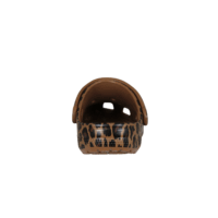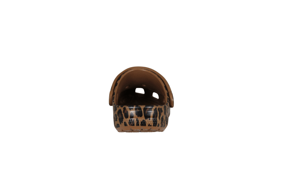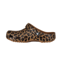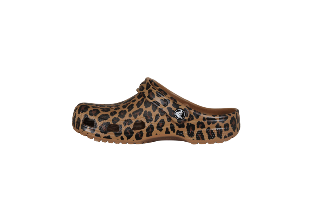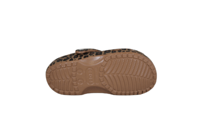 Klassisk leopard farvet crocs. Skoen er lavet i gummi, hvilket gør den kan bruges både i haven, vandet og som hjemmesko. Sålen er god blød at gå på, da det giver lidt efter.