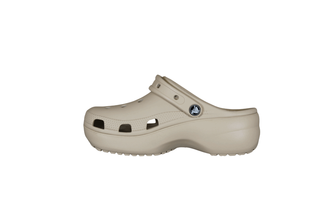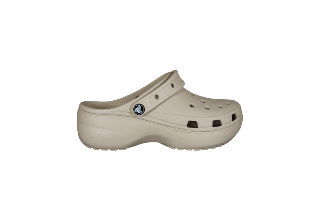 Klassisk bone farvet crocs med plateau sål. Skoen er lavet i gummi, hvilket gør den kan bruges både i haven, vandet og som hjemmesko. Sålen er god blød at gå på, da det giver lidt efter.