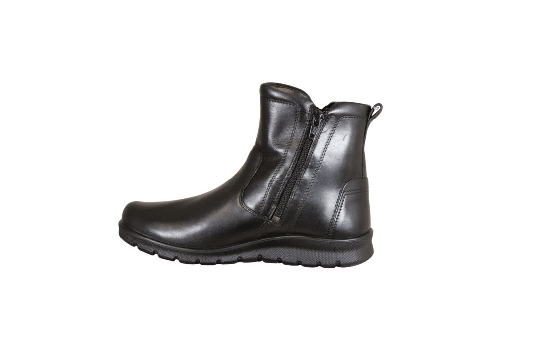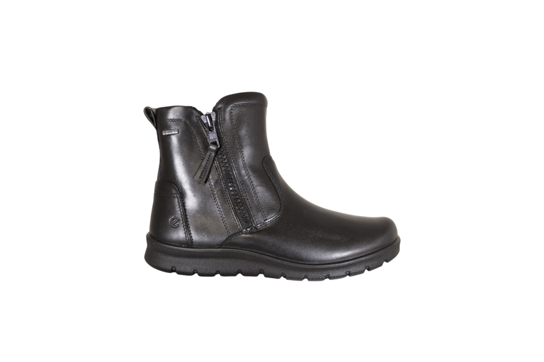 ECCO BABETT BOOT 215573-11001 (054-729). Kort skindstøvle med 2 lynlåse, så den er nem at hoppe i. Støvlen er med GORE-TEX, så den er 100% vind-og vand tæt, samt åndbar. Inder sålerne ligger løst i støvlen, så de kan tages op. En meget let og fleksibel støvle, der er god til de kolde dage.