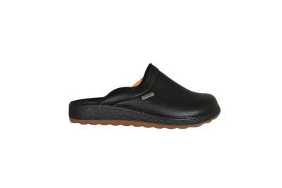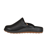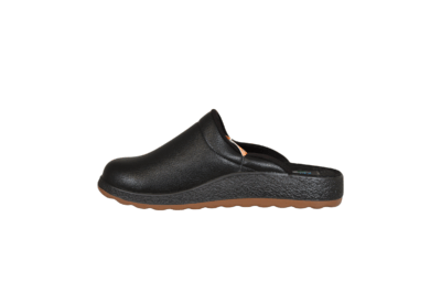 FLY FLOT 52 719 2 L (027-497). Let og fleksibel herre hjemmesko med åben hæl. Tøflen er lavet i vegansk materiale, og foret med tekstil indvendig. Materialet er blankt på snuden, så kan tørres af med en klud.