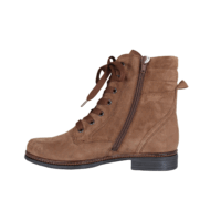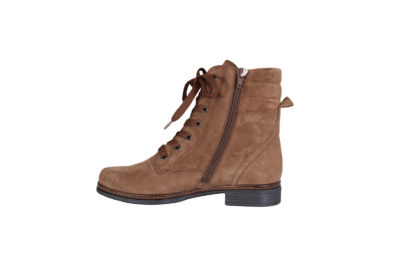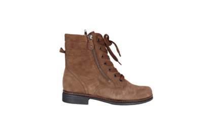 Super smart brun støvle fra Gabor. Overdelen er lavet i brunt nubuck. Støvlen har en lynlås på hver side, og snørebånd op langs vristen, så den kan spændes godt fast til foden. Indvendig er den foret med brunt tekstil. Slidsålen er en brun gummisål, så man står godt fast.