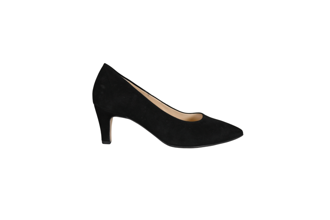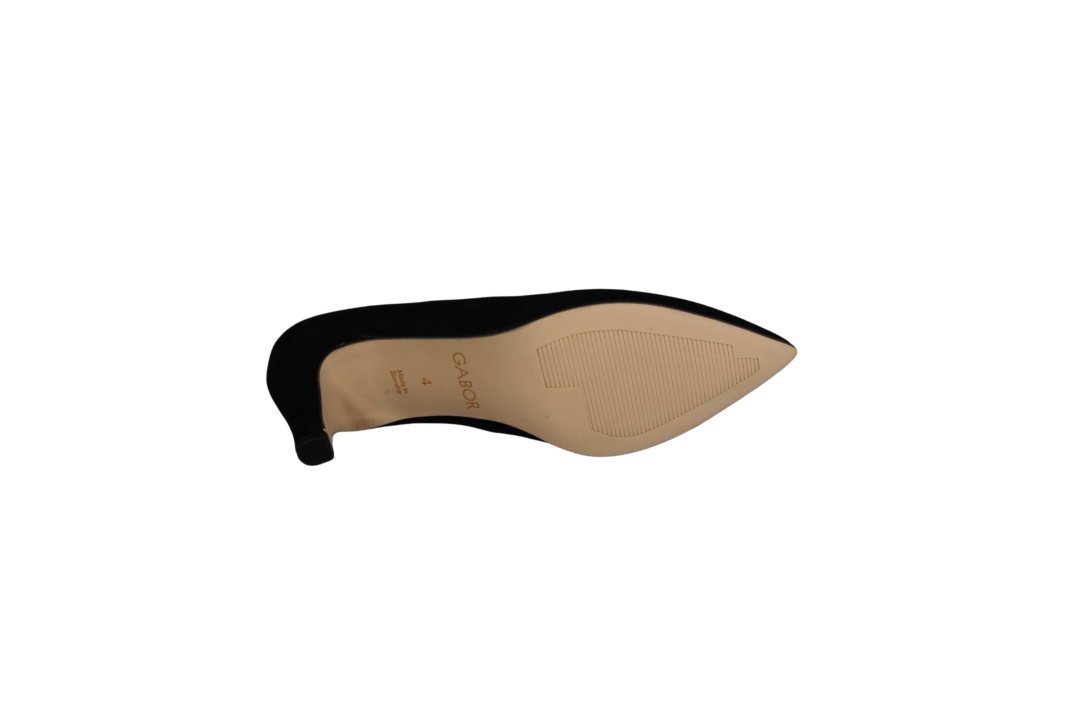 GABOR 81.390.17 (036-663). Flot sort pumps i nubuck skind med hæl på 5,5 cm. Foret er i skind og indersålerne er polstret, så skoen er blød at gå med. Ydersålerne er en tynd gummisål med en gummihæl. En flot pump, der kan bruges til det meste i garderoben.