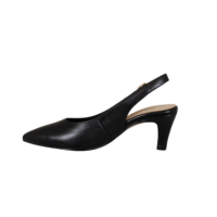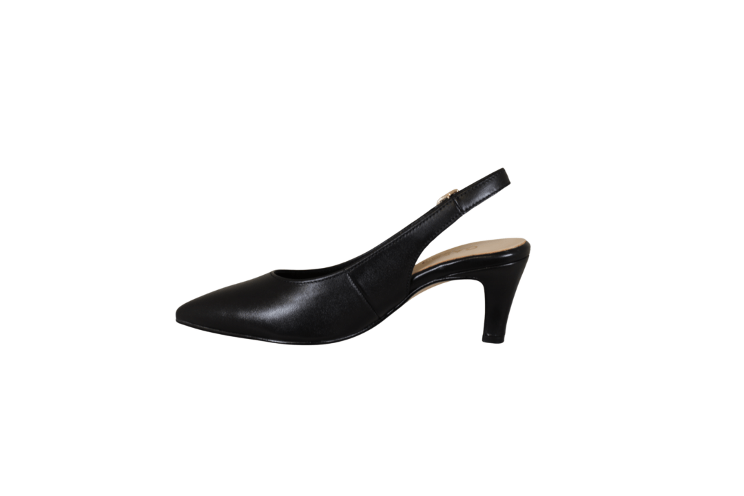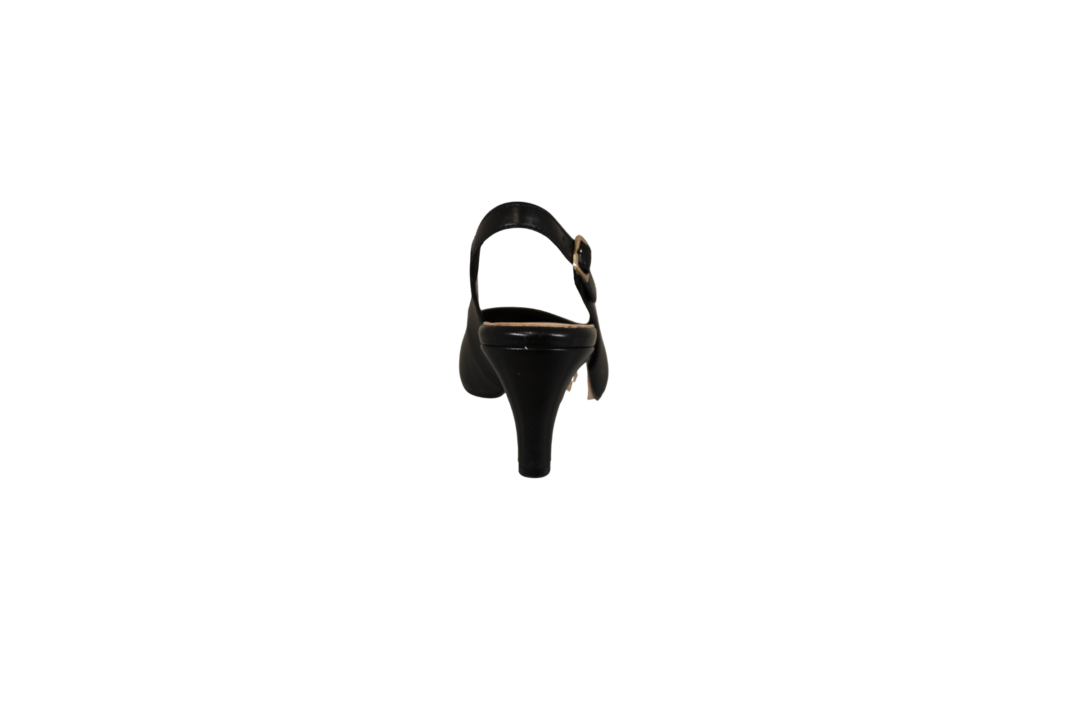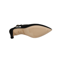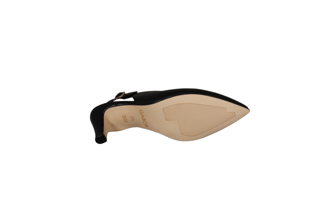 GABOR 81.590.27 SORT (221-2144). Sort smuk stillet med sling back bagrem, og på en 5,5 cm tynd hæl. Remmen kan justeres med en guld spænde. Materialet er glat skind både udvendig og foret med skind, hvilket giver en god fornemmelse med bare tæer. Slidsålen er ikke gummi, så et glattere materiale der gør man kan danse i den.