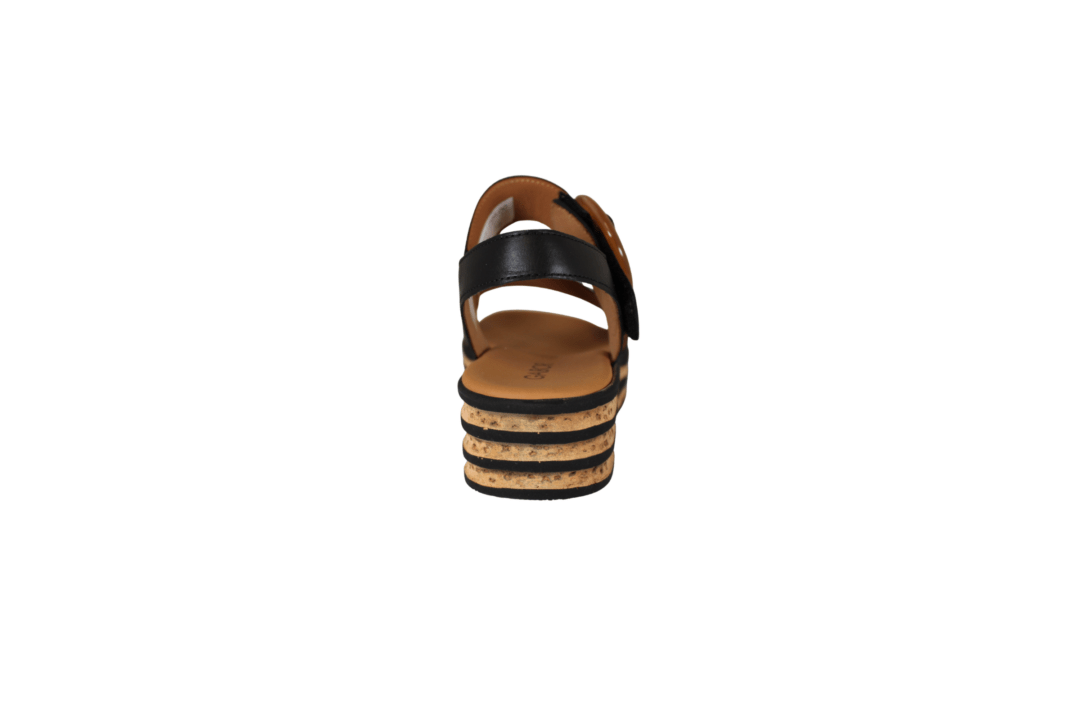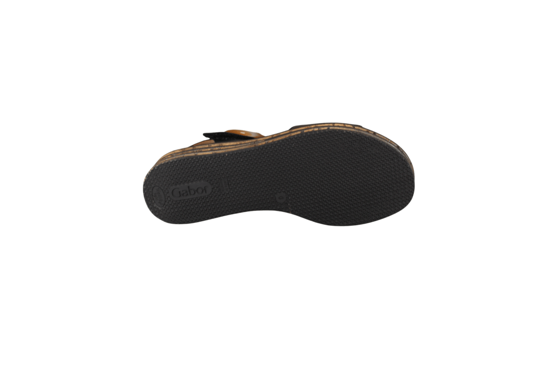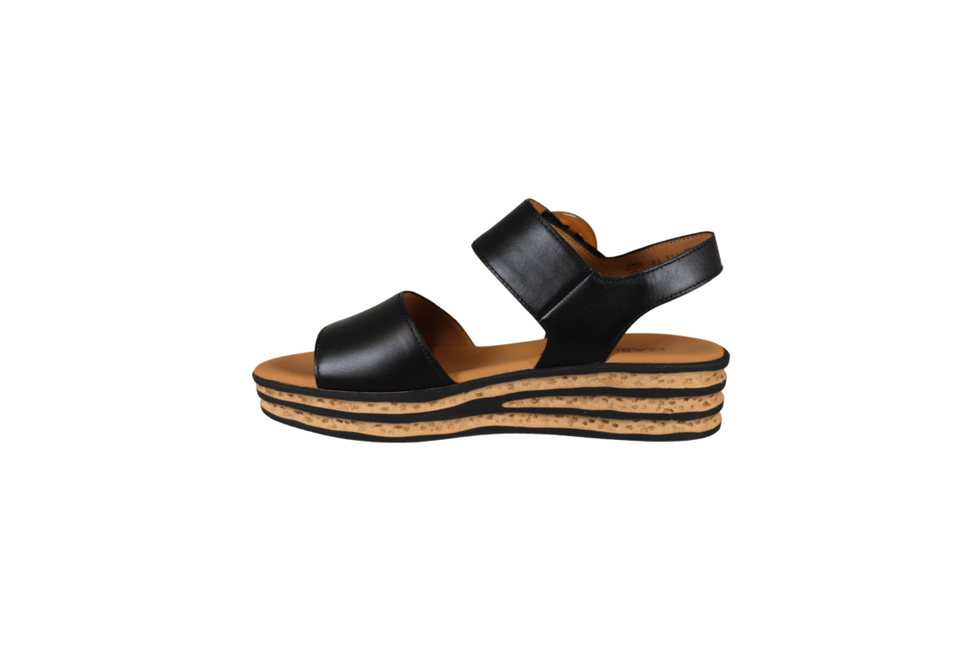 Flot Gabor sandal på 4 cm hæl, med rem over vristen med et stort spænde, under spændet er der et lille velcro rem, så den er nem at komme i. Inder sålerne er polstret, så de er bløde at gå med. Kiksekagen såler. En rigtig god sandal til mange formål, både til daglig og til festerne.