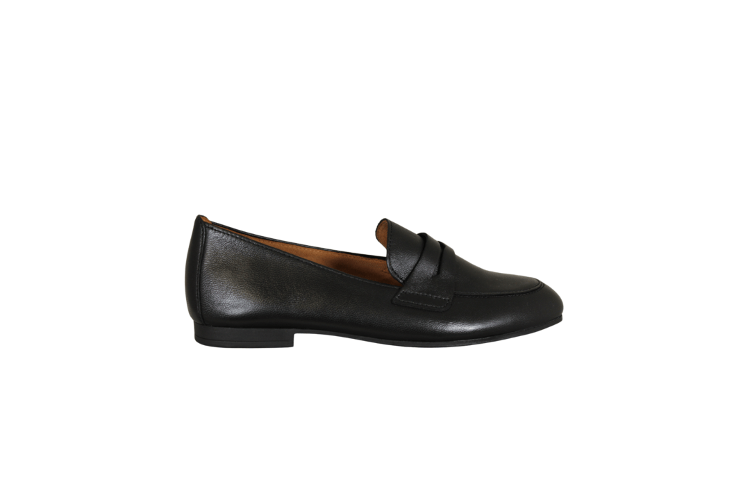 GABOR 85.213.27 (031-567). Flot og meget enkelt sort skind loaffers, med en tynd gummisål. En meget let og fleksibel sko, der passer til det meste i garderoben. Indvendig er sålen polstret, så skoen er bløde at gå med. Hælen er 1,5 cm høj.