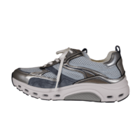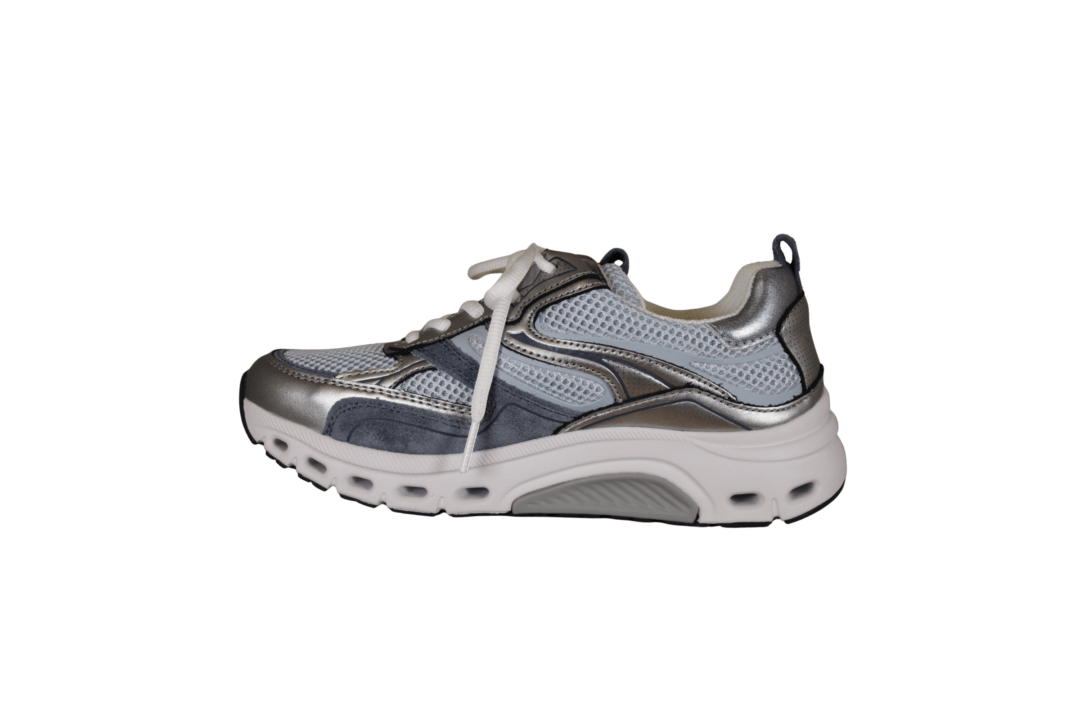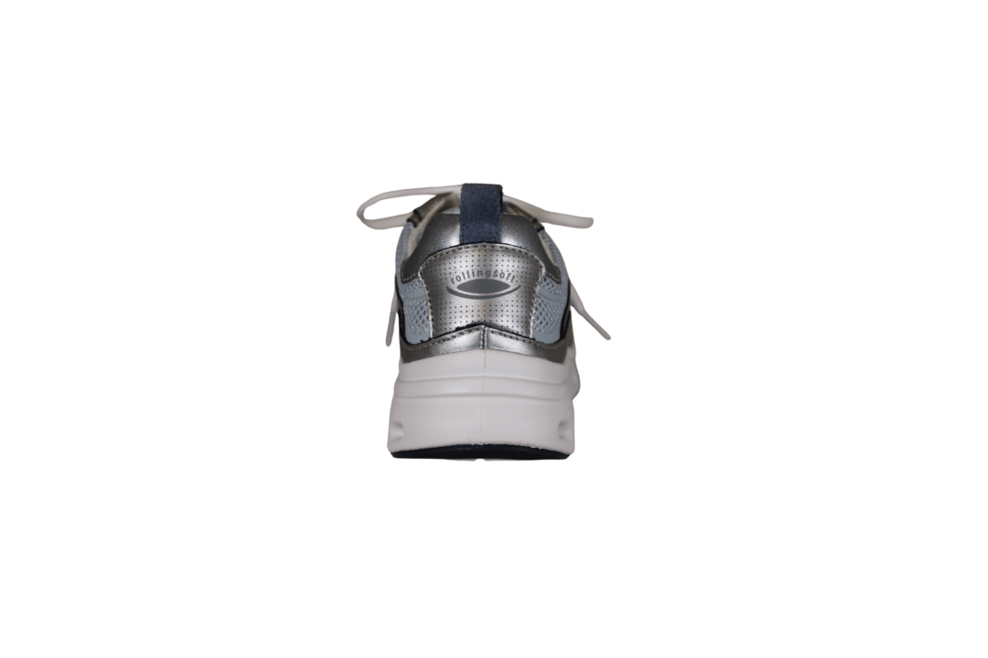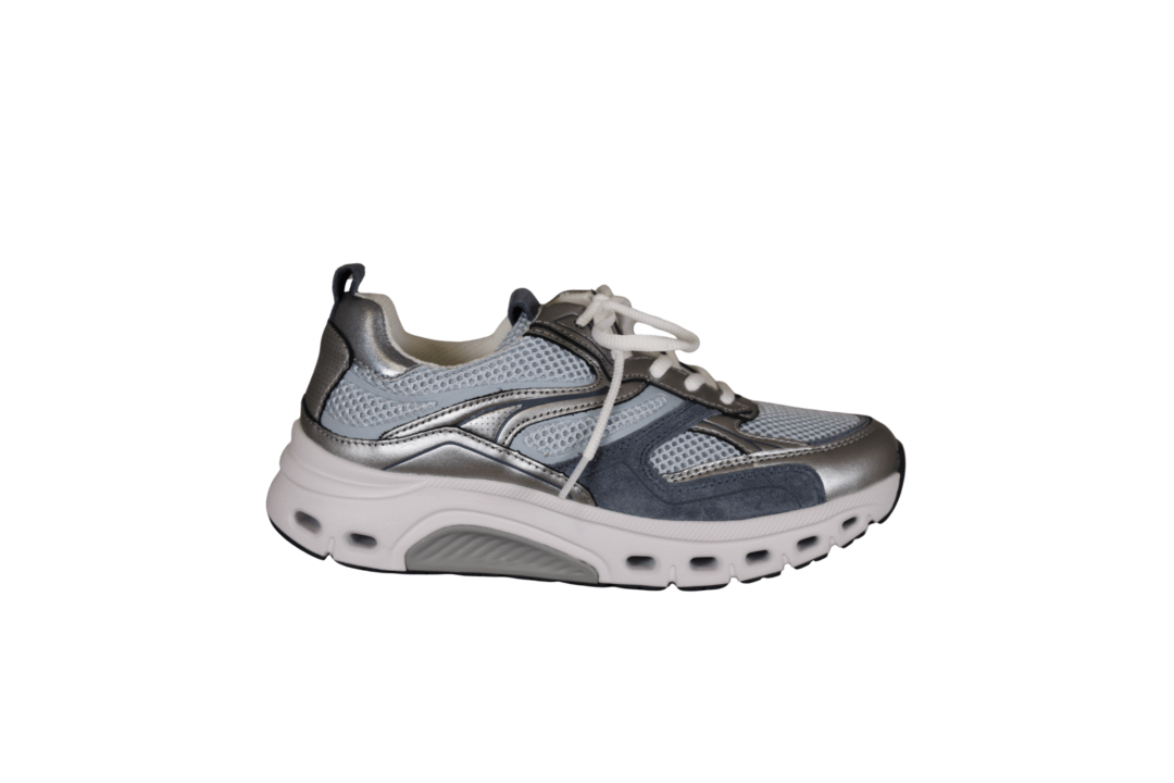GABOR 86.986.26 ROLLING SOFT (245-0995). Lyseblå sneakers med sølv detaljer rundt på skoen. Skoen er lavet i et blandingsprodukt udvendig, og foret med tekstil indvendig. Ydersålen er den gode ROLLINGSOFT, der giver en god støtte til foden – ingen tryk på hæl eller forfod. Indvendig sål kan tages ud, hvis man har behov for sin egen. Ydersålen har huller i sålen, der giver et smart look.