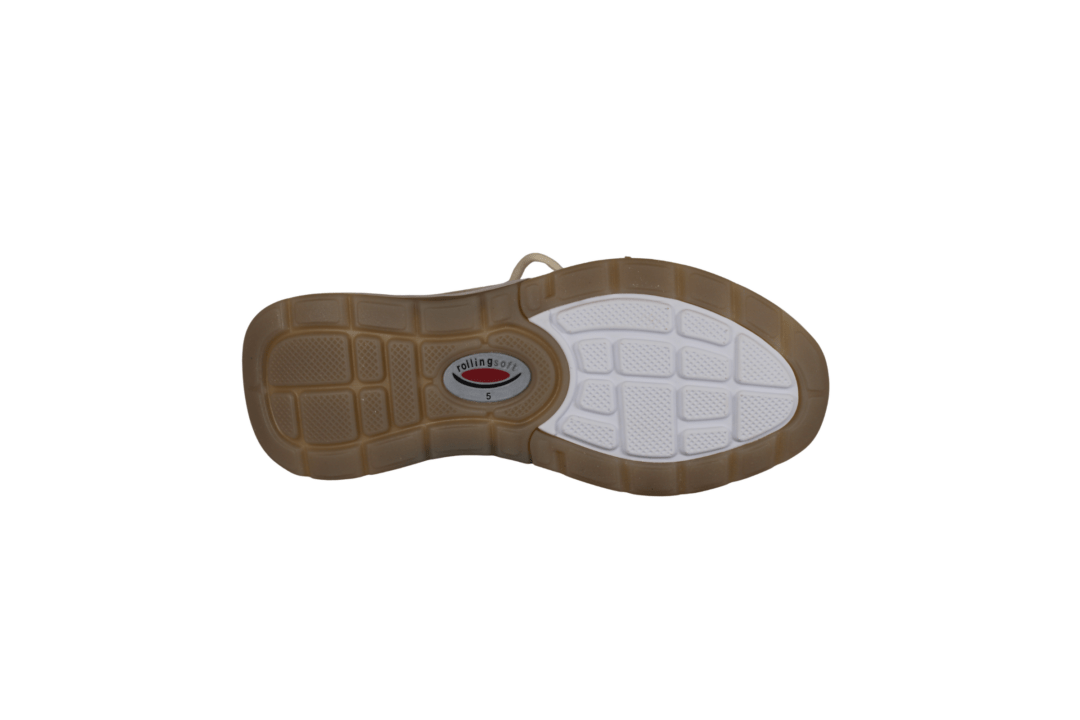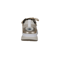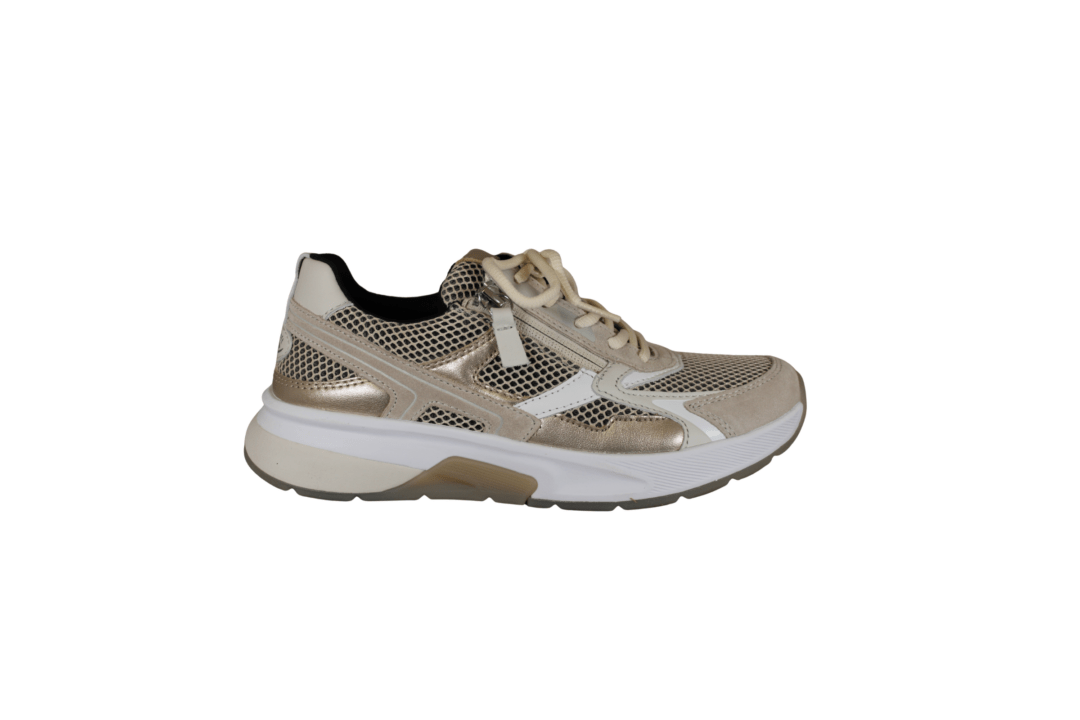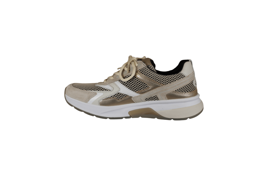 GABOR 86.848.34 ROLLING SOFT (245-1008). Beige sneakers med guld detaljer rundt på skoen. Skoen er lavet i et blandingsprodukt udvendig, og foret med tekstil indvendig. Ydersålen er den gode ROLLINGSOFT, der giver en god støtte til foden – ingen tryk på hæl eller forfod. Indvendig sål kan tages ud, hvis man har behov for sin egen. Ydersålen har huller i sålen, der giver et smart look.