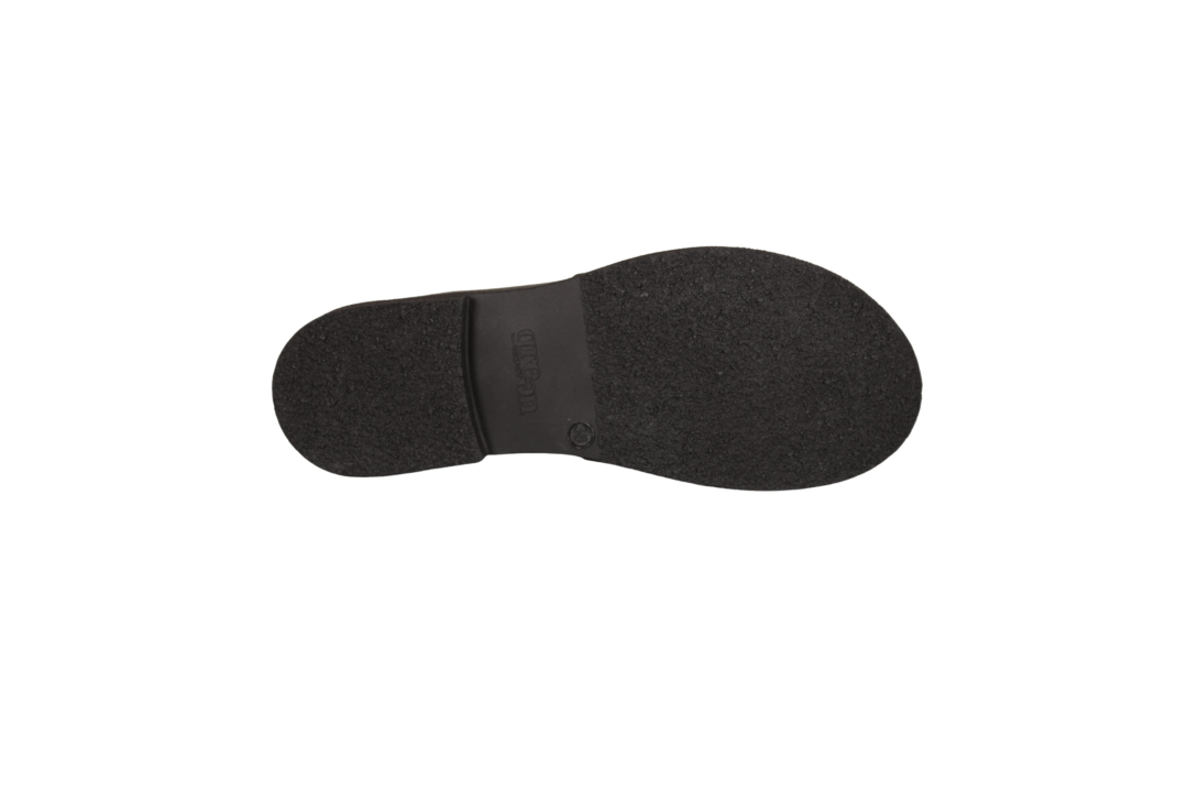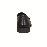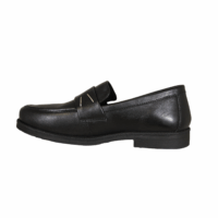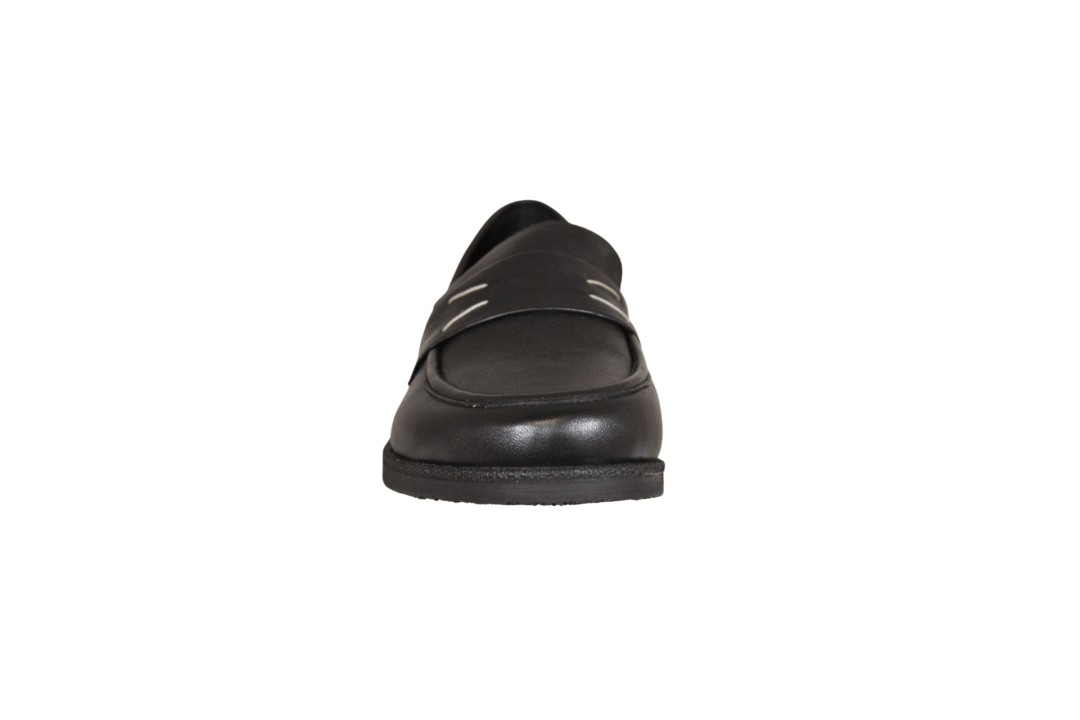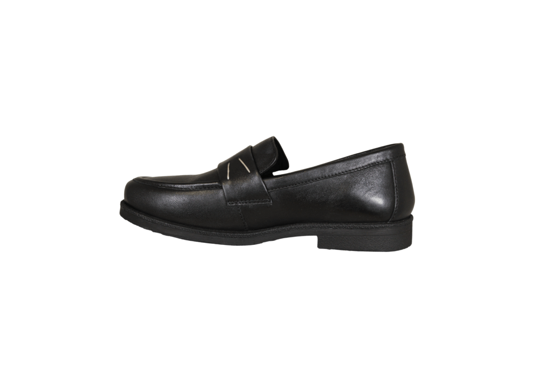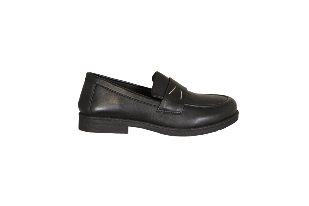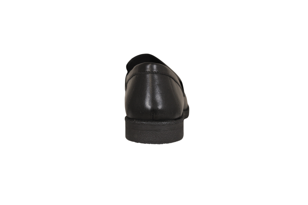 Smart sort klassisk loafers i læder betrukket. Over vristen er der en rem med syninger, som giver lidt blinkfang til skoen. Indvendig er den foret med brunt tekstil. Slidsålen er en sort gummi sål, med en hælhøjde på 2 cm.