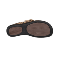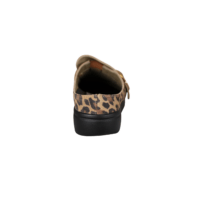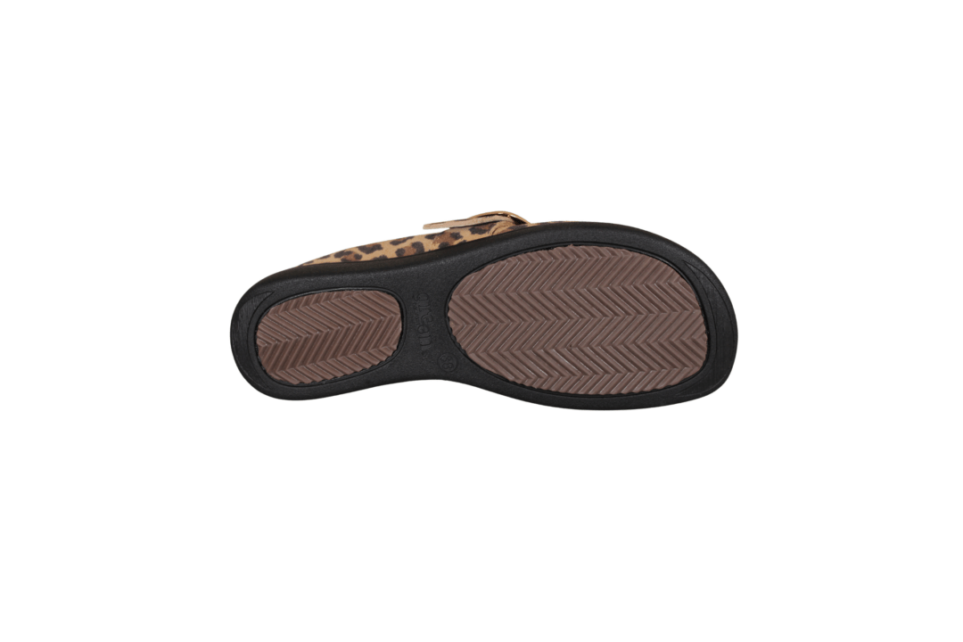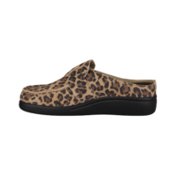 Flot leopard farvet skind slippers med stort guld spænde. Indersålerne er formstøbte med fodseng, polstering og ligger løst i skoen, så skoen er god blød at gå med. En nem sko, at hoppe i, god til daglig brug, passer til det meste i garderoben.