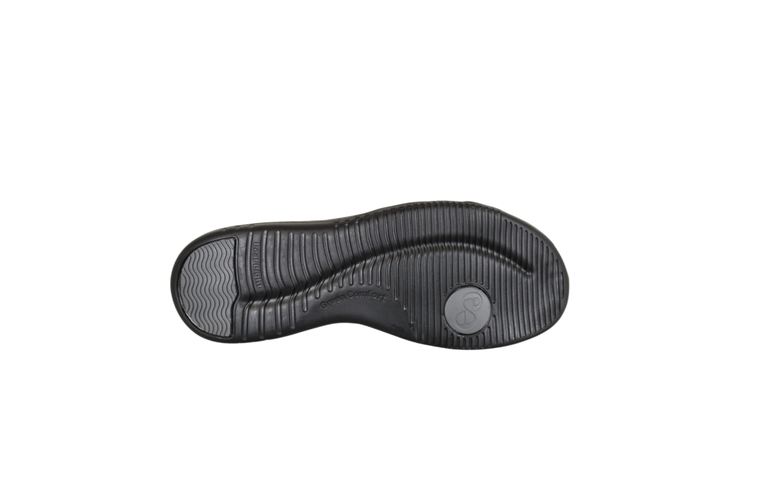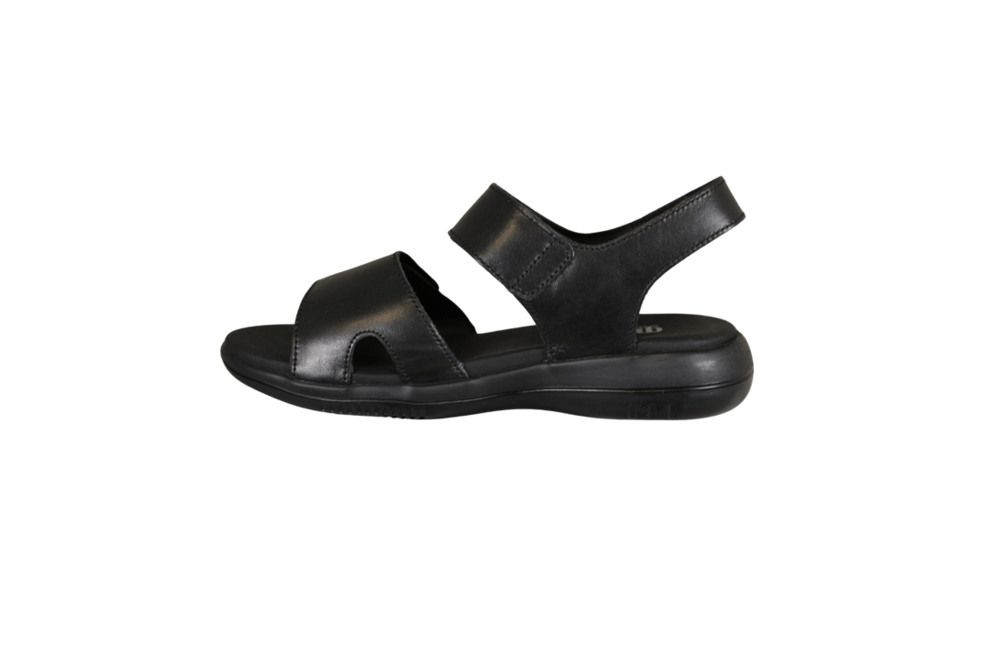 GREEN COMFORT LEAF 422004 Q30 SORT (425-1063). Let sandal lavet i sort skind, kan reguleres i tre velcro remme ved hæl, vrist og forfod. En sandal der rummer godt, men ser let ud. En meget let og fleksibel sandal, sålerne er med stødabsorberende såler. Indvendige sål er en 6 mm Energy sole. Foringen og indvendige sål er beklædt med Soft Tex, hvilket er god til at absorbere fugt. God til daglig brug, samt til sommer festerne.