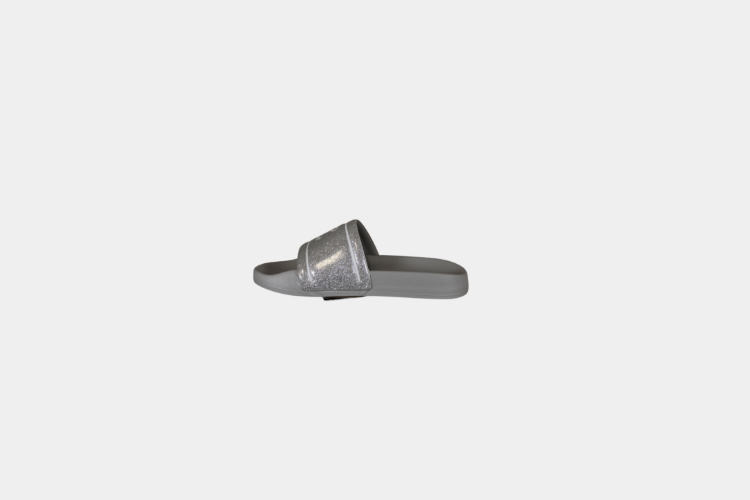 Hverdags eller badesandaler i sølv med glimmer til pigerne. Sandalerne er lavet af gummi, så de tåler vand.
