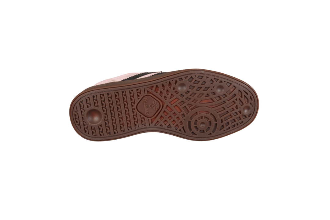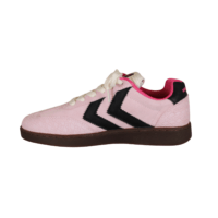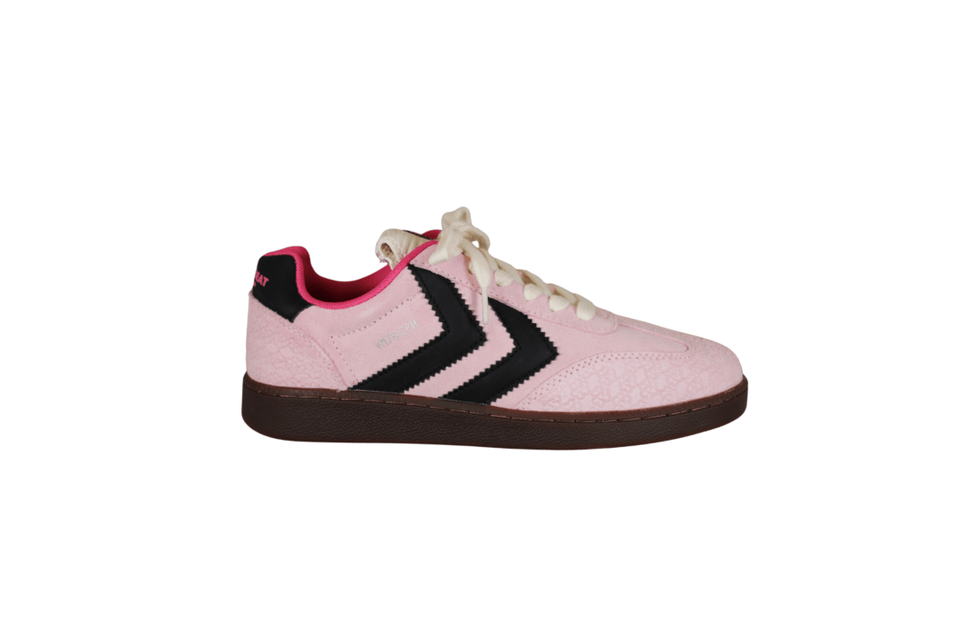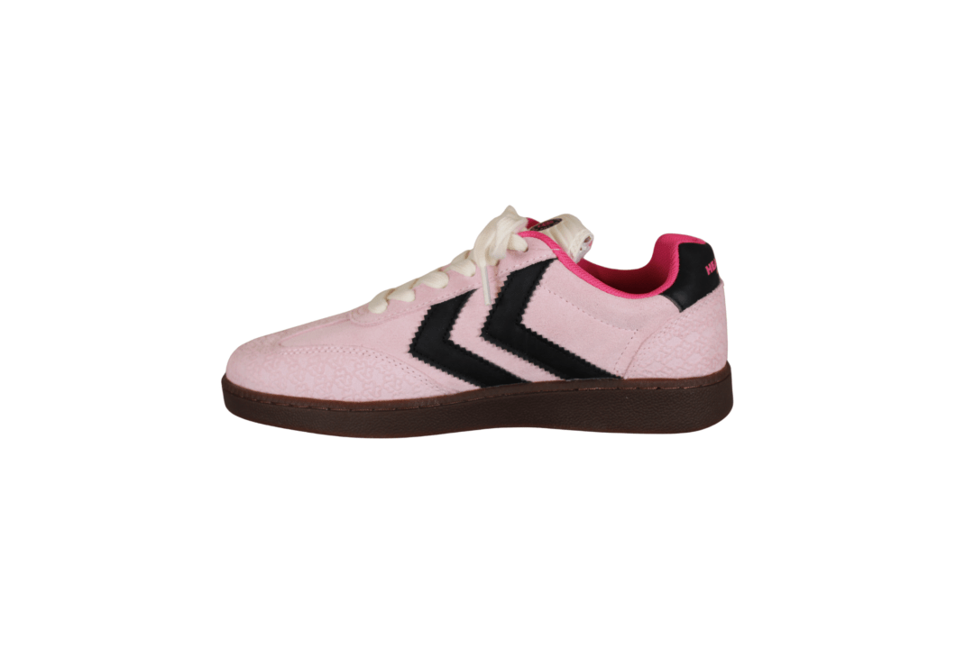 HUMMEL 232434-3333 VM78 CPH HEARTBEAT (035-019). Lyserød sneakers med HEARTBEAT mønster i snuden og på hælkappen. Materialet er skind (nubuck) med sorte veganske striber på siden. Indvendig er skoen foret med tekstil. Pløsen på skoen er ekstra lang, så den folder ned over snørebåndet. Slidsålen er en mørke brun gummi sål.