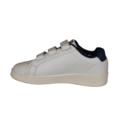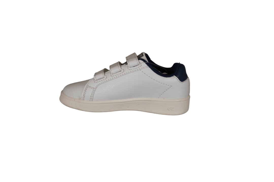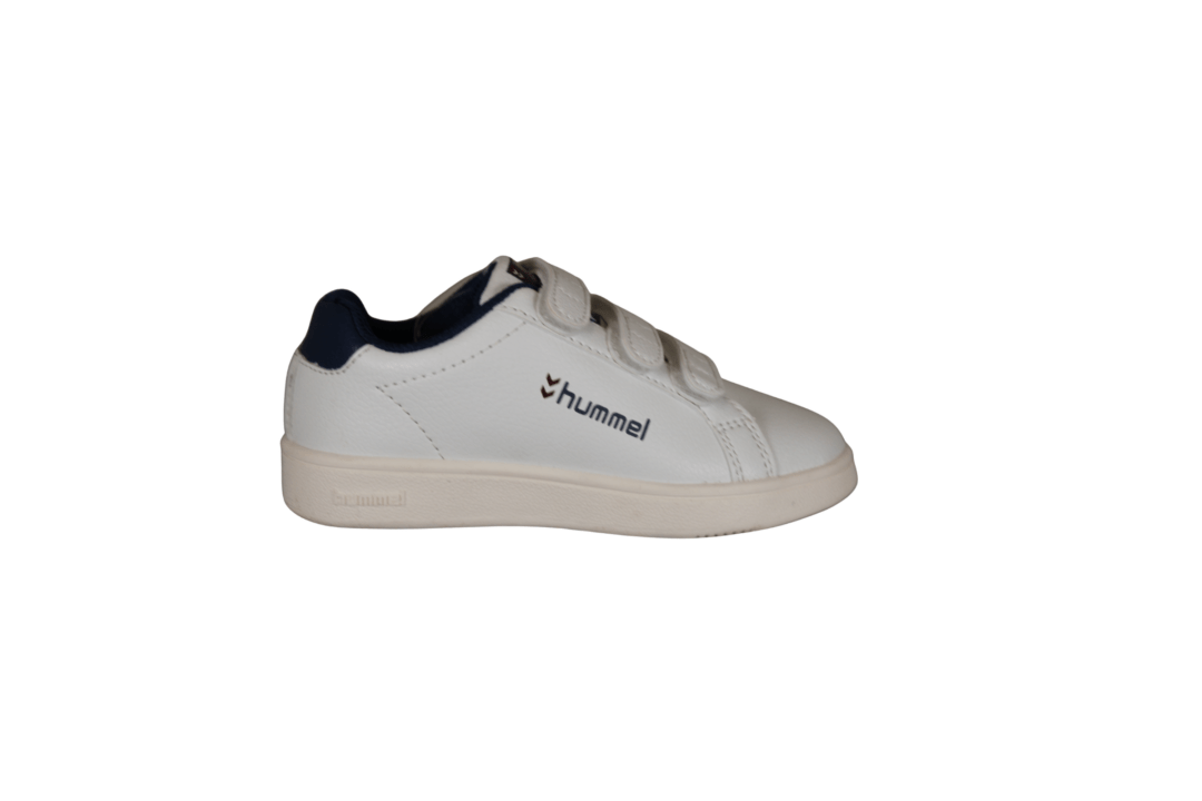HUMMEL MATCH POINT JR 230175-9153 (065-807). Helt enkelt vegansk hvid sneakers med 3 velcro remme, hvor man kan klippe remmene til, så de passer. Indersålerne er polstret, så skoene er bløde at gå med. Praktisk blå i indsteppet og på hælkappen. En god sko til daglig brug eller til pænere brug.