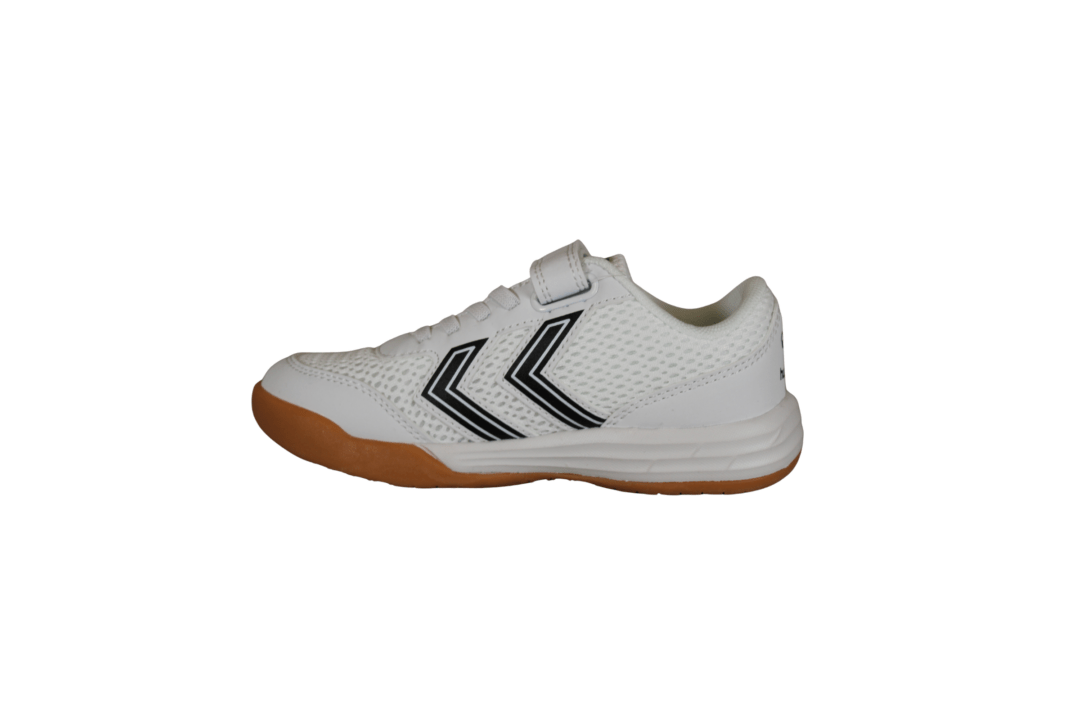 HUMMEL MULTIPLAY FLEX VC JR 224853-9124 WHITE (065-803). Hvid klassisk kondisko til både drenge og piger. Skoen er lavet i en blanding af tekstil og vegansk materiale. Nem for barnet selv at tage på med et velcrobånd. Slidsålen er lavet i naturfarvet gummi, så det ikke smitter af på indendørs gulve.