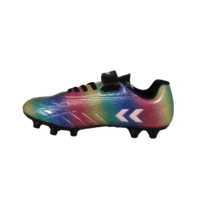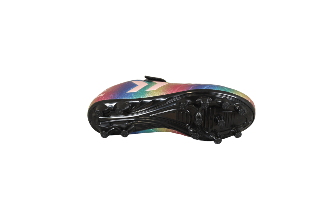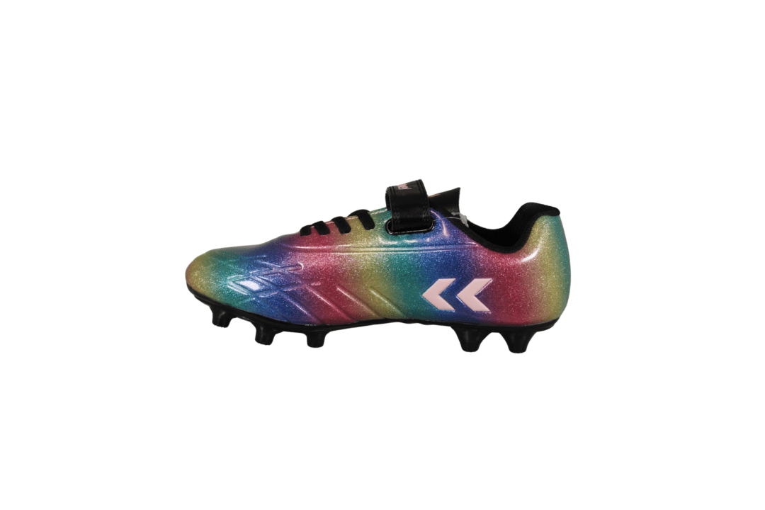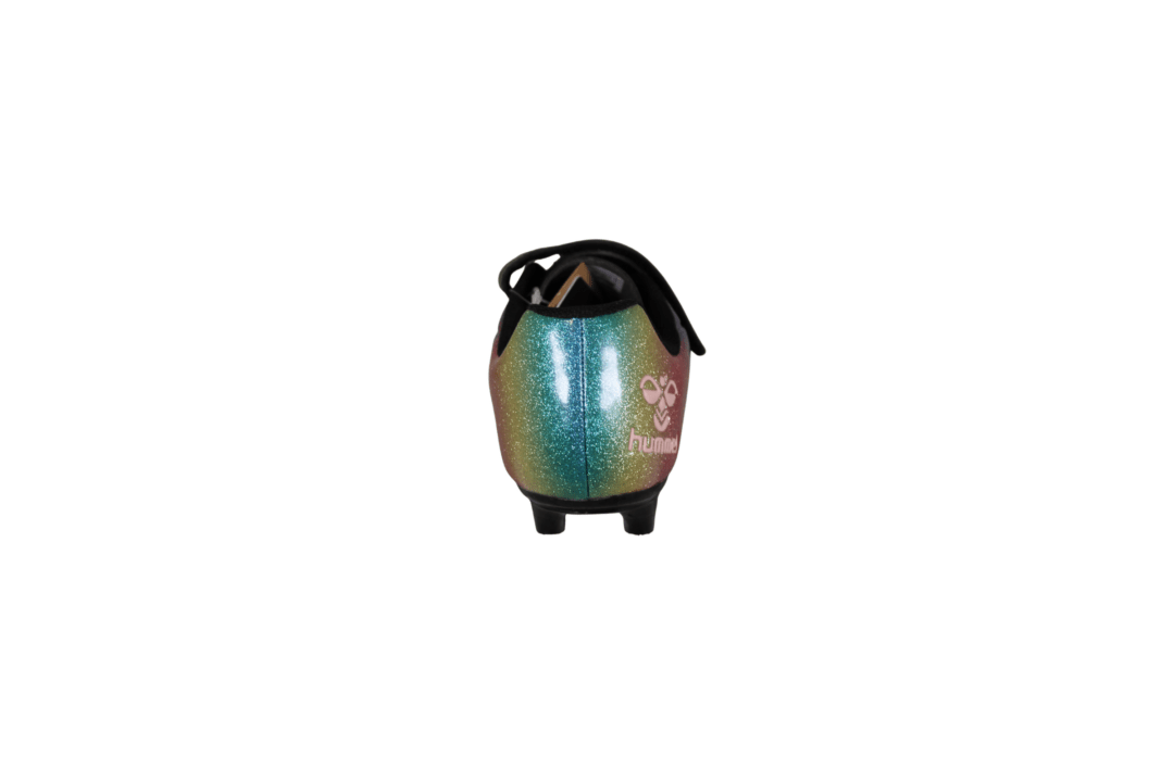 HUMMEL TOP SPAR F.G JR 216568-3949 PINK-A-BOO (741-3678). Fodboldstøvle fra HUMMEL i regnuefarver med glimmer i. Skoen er lavet i vegansk materiale og foret med tekstil indvendig. Sålen er lvaet med gummi knopper. Hen over vristen sidder der elastik snørebånd med et velcrobånd øverst.