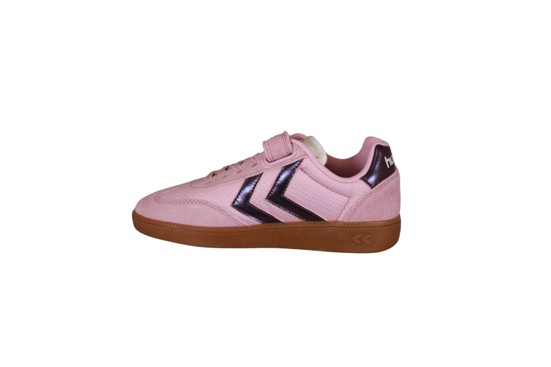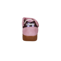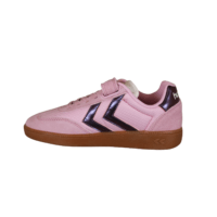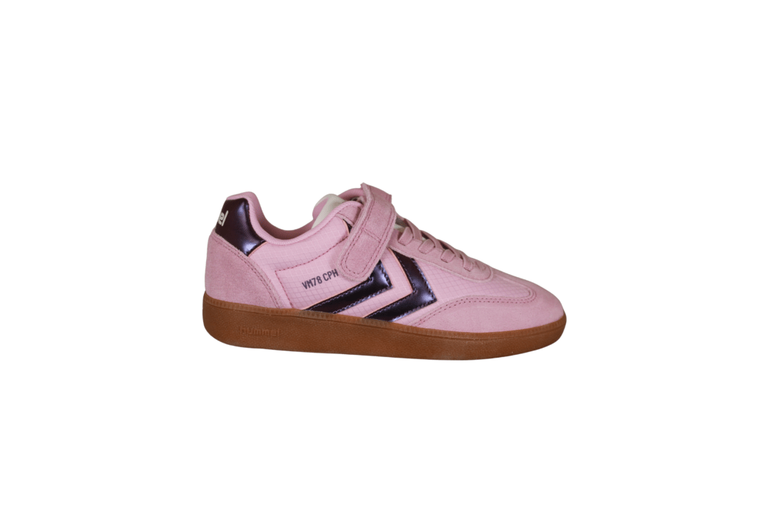 HUMMEL VM78 CPH HCH JR 232686-3030 PINK (741-3676). Pink sneakers fra HUMMEL i en flot pink farve med lilla “kobber” striber på siderne og hælkappen. Nem for barnet selv at tage på med det ene velcrobånd. Materialet er en blanding af tekstil og skind udvendig, og foret med tekstil indvendig. Slidsålen er lavet i naturfarvet gummi.