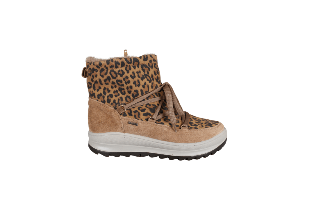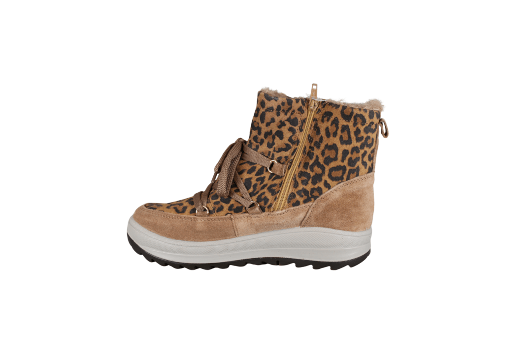 IMAC 859019 7181/017 CARAMEL/BROWN (525-1154). Lys brun vinterstøvle fra IMAC med leopard print. Materialet er brunt skind (nubuck) udvendig, og foret med tekstil indvendig. På indvendig side er der en lynlås, og på forbladet er der snørebånd. Støvlen har IMAC-TEX, hvilket betyder den er vandtæt. God kraftig sål til de gode vandreture, samt vinterdage med glatte veje.