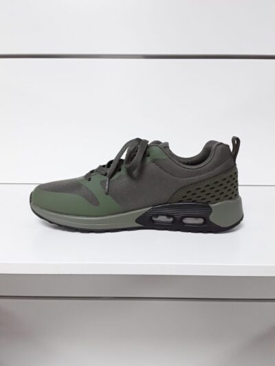 KANGAROOS X2200 12011-825(005-821). Flot sneakers i oliven grøn med snørebånd. Inder sålerne er formstøbte og kan tages ud af skoene. Sålerne er med luft polstring i hælene. Under pløsen er der en lille lomme. en meget let og fleksibel sneakers, god til daglig brug.