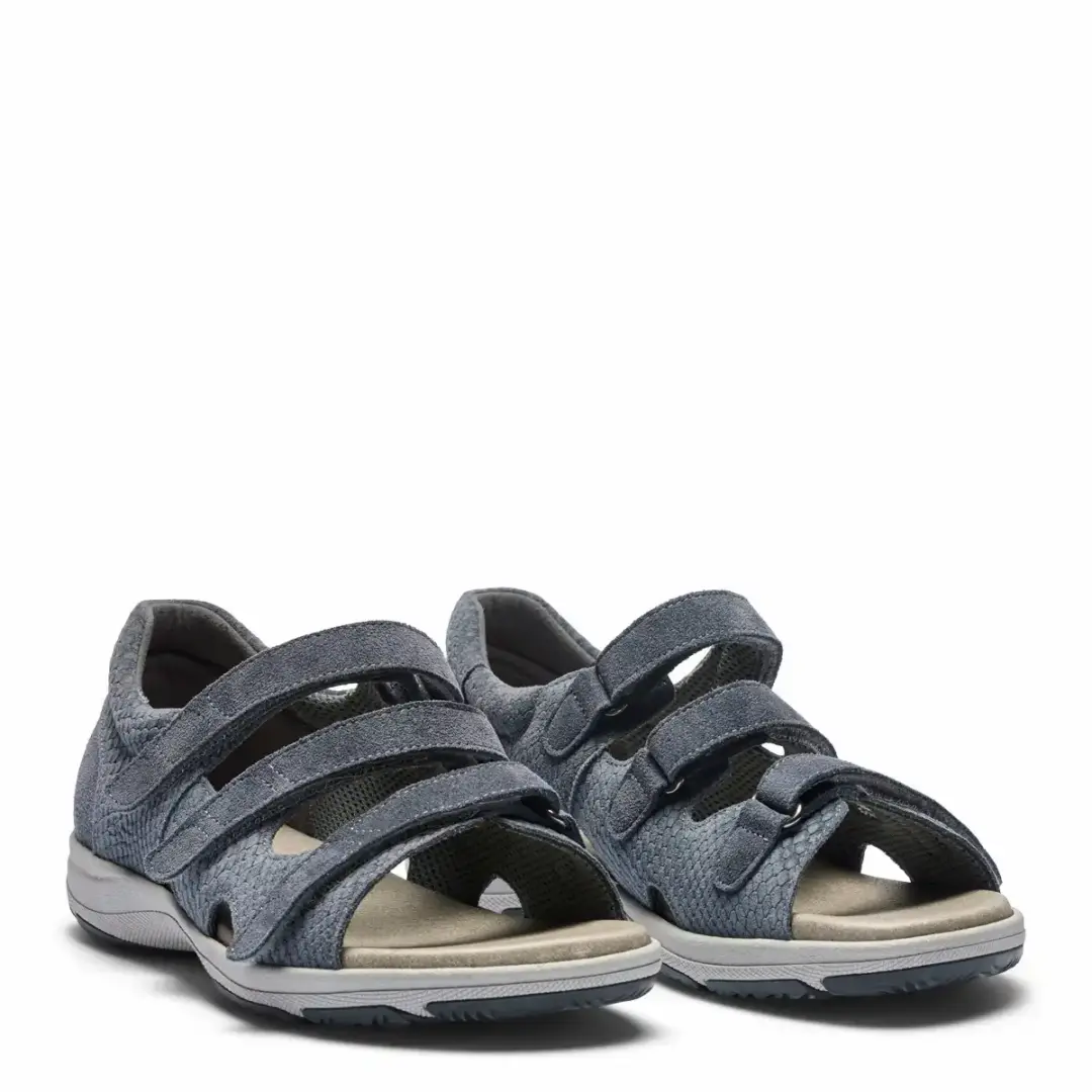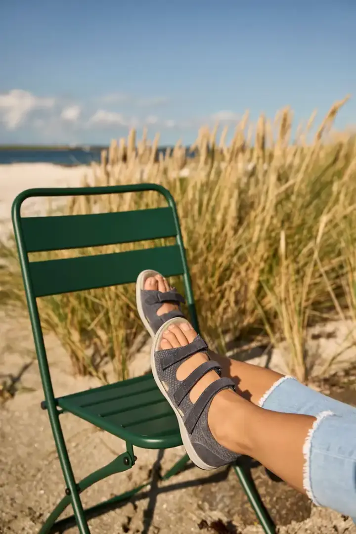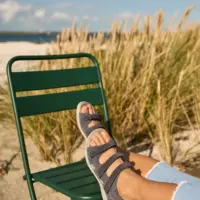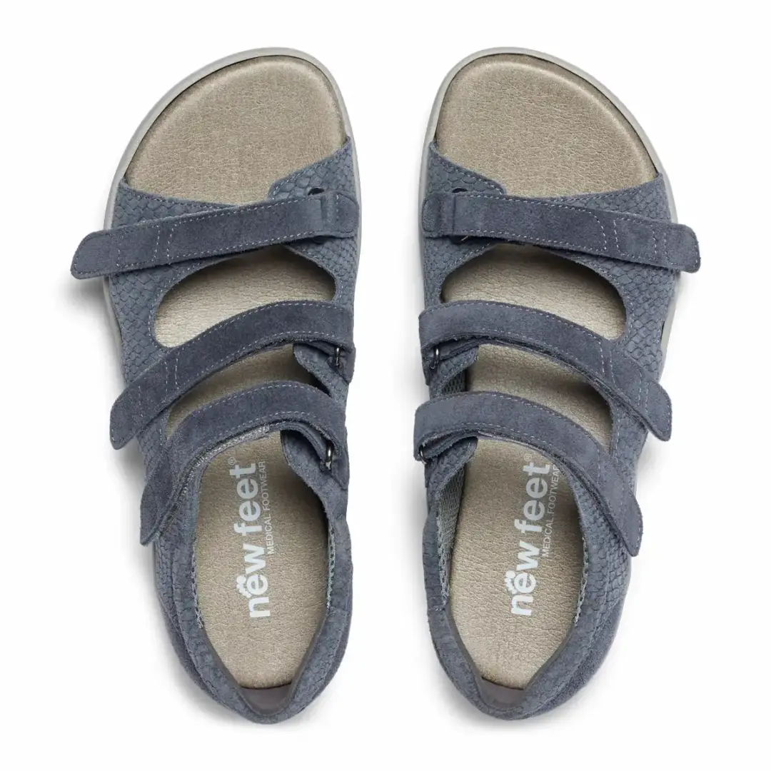 NEW FEET 211-35-1942 GREYISH BLUE (425-1231). Grå/blå klassisk sandal med rigtig god støtte fra den faste hælkappe. Skoens ydre materiale er skind, og foret med tekstil indvendig – der er ingen indvendige syninger. Indlægssålen er 6mm. Hen over foden er der 3 justerbar velcrobånd – du kan klippe af båndet hvis de bliver for lange. Rigtig god sandal til ømme fødder, eller du lider af gigt eller diabetes. Ydersålen har ekstra gummi stykker, hvilket gør du står bedre fast. Rigtig god trave og hverdagssandal.