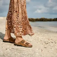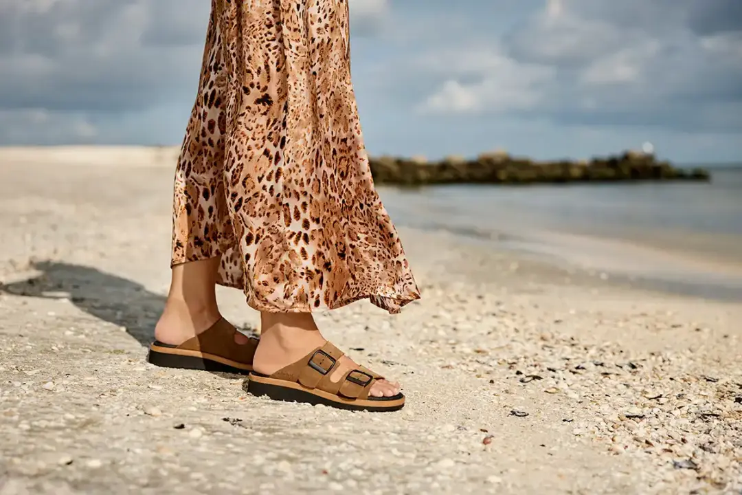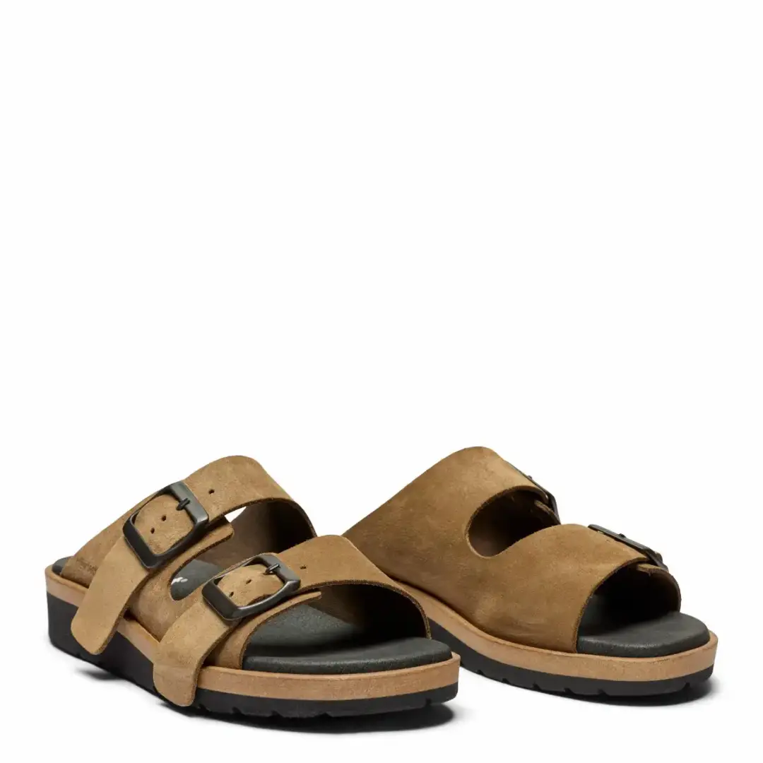 Brun slenters i ruskind på en let sål. Den er med to brede regulerbare remme over foden, med sorte metalspænder på. Indlægsålen er sort og er 6 mm. tyk. Sålen har en utrolig god støtte, er stødabsorberende og blød. Denne model har ekstra støtte i svangen. Indlægssålen sidder fast med velcro. Sålen er sort og er lidt højere bagtil. Dette giver en god holdning. Det højeste sted måler 3,1 cm. Mellemsålen er af kork. Slidsålen er en sort gummisål. Sandalen er meget velegnet til gigtramte, diabetiker og følsomme fødder.
