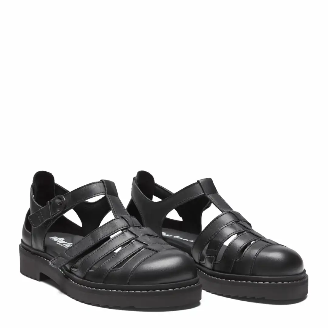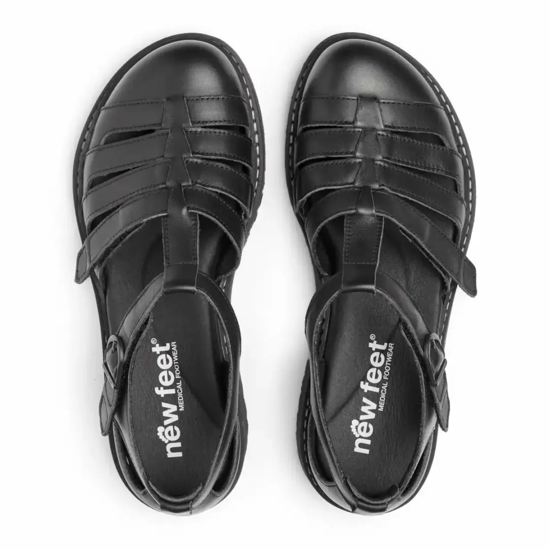 NEW FEET 231-18-110 SORT (425-1003). Sort klassisk sandal med både lukket hæl og snude. Sandalen er i skind udvendig, og foret med vegansk indvendig. Indvendig sål har indbygget svang støtte – sålen sidder fast med velcrobånd. Sandalen har 2 velcrobånd – hen over vristen og midt på foden. Slidsålen er en grov moderne sål med hvid syning rundt i kanten.