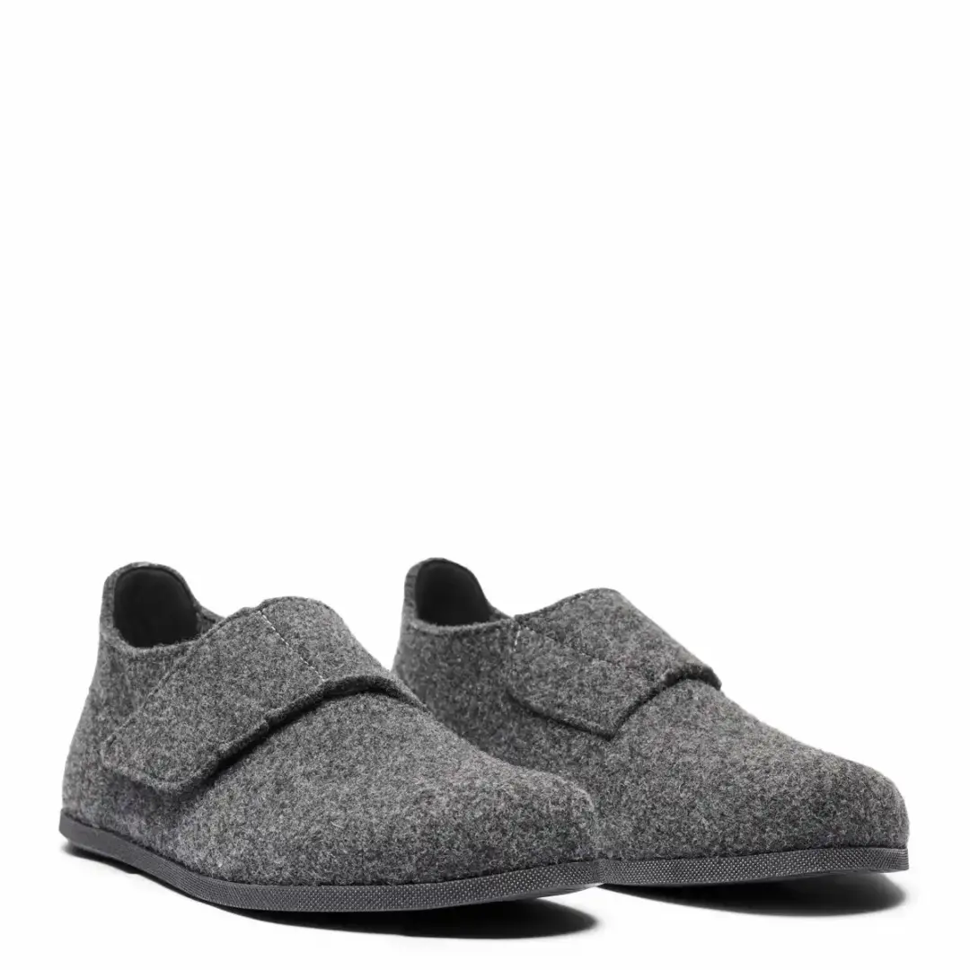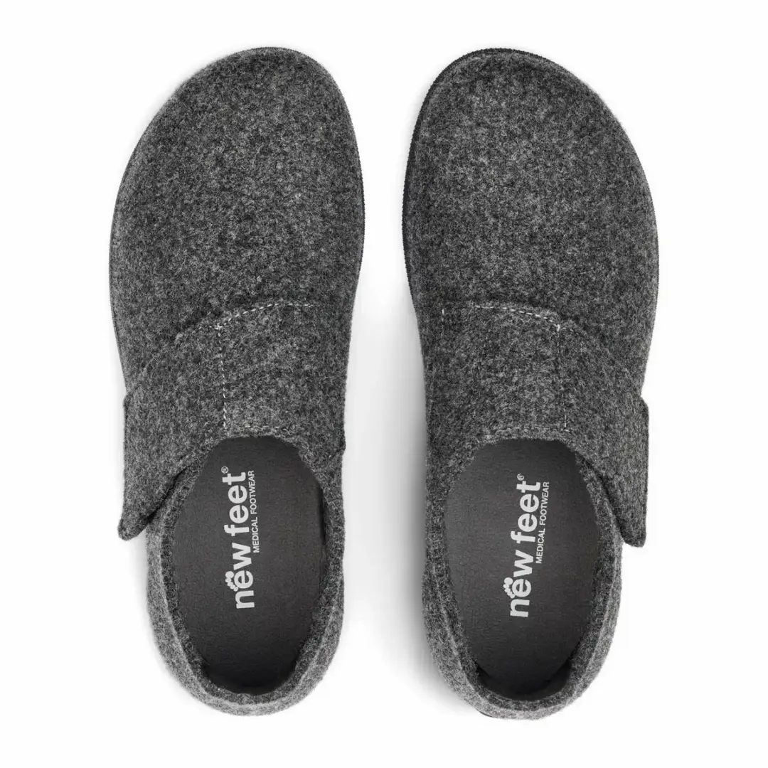 NEW FEET 252-22-911 KOKSGRÅ (601-0286). Hjemmesko fra New Feet med en rigtig god bredde til de ømme tæer. Hen over vristen er et bredt velcrobånd, der kan spændes til foden. Materialet er slidstærkt uld, hvilket gør den holder godt på foden. Ydersålen er lavet i PU gummi. Indvendig i skoen er der en 6 mm stødabsorberende sål, som aflaster fødderne.