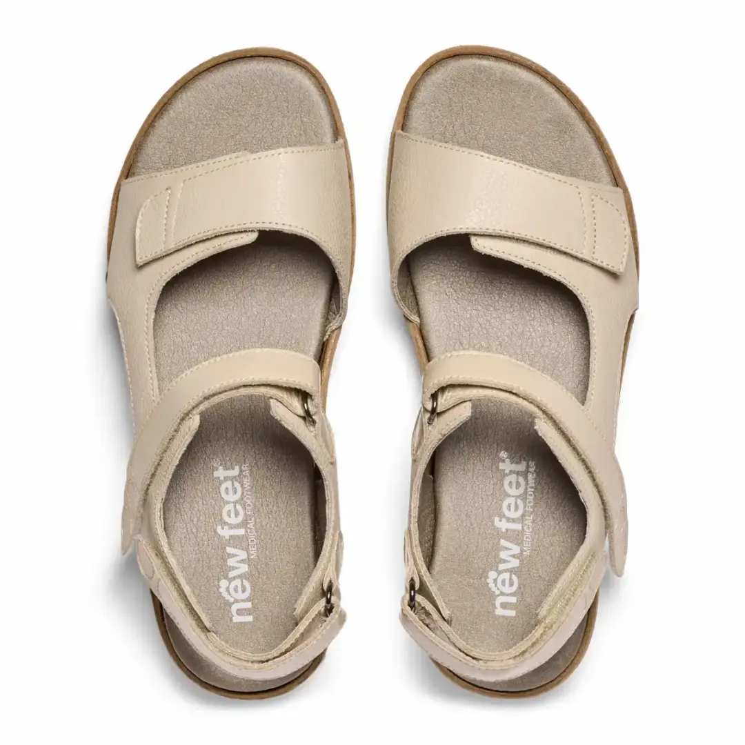 NEW FEET 261-19-135 SAND (425-1263). Sandfarvet sandal fra NEW FEET i skind (nubuck) udvendig – den øverste og bagremmen er betrukket med lak. Indlægssålen har den gode stødabsorberende sål, samtidig med den giver svangstøtte. Alle remmene har syninger, så man kan forkorte i dem.