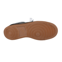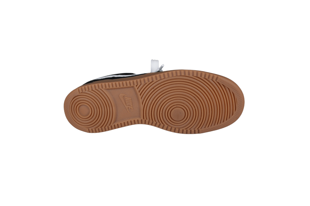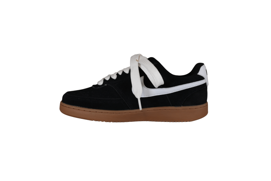 NIKE COURT VISION LO IO7727 001 (741-3691). Sort ruskinds sneakers med hvidt Nike logo på siden og på pløjsen, samt logo på hælen. Store brede hvide snørebånd. Indersålerne er polsteret, så skoen er blød at gå med. Ydersålerne er brun, natur farvet. Skoen er taget med inspiration fra skater milijøet. Husk Nike er små i størrelsen, er du i tvivl så gå en størrelse op.