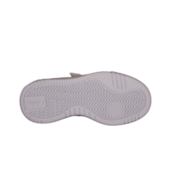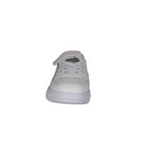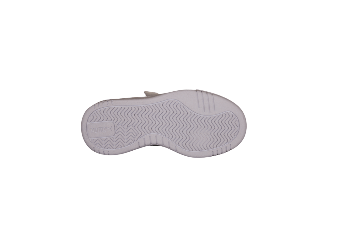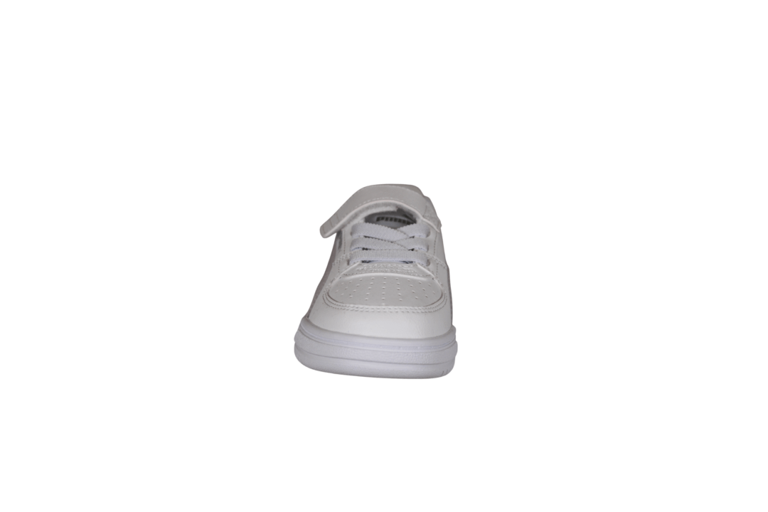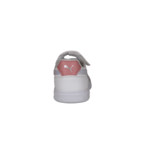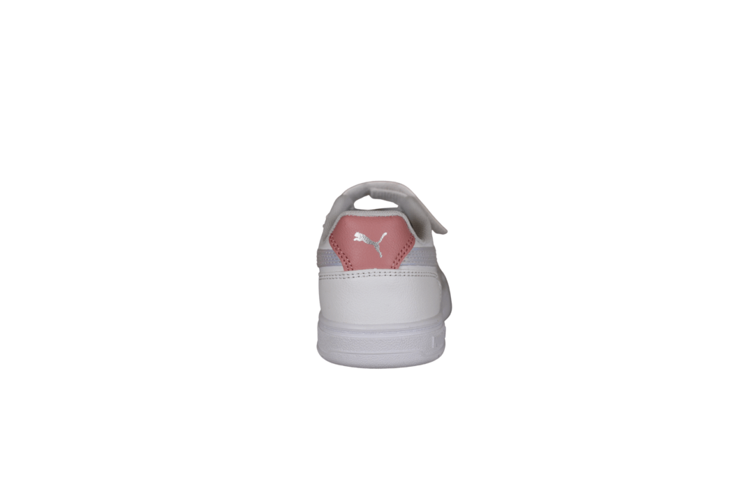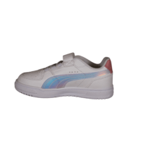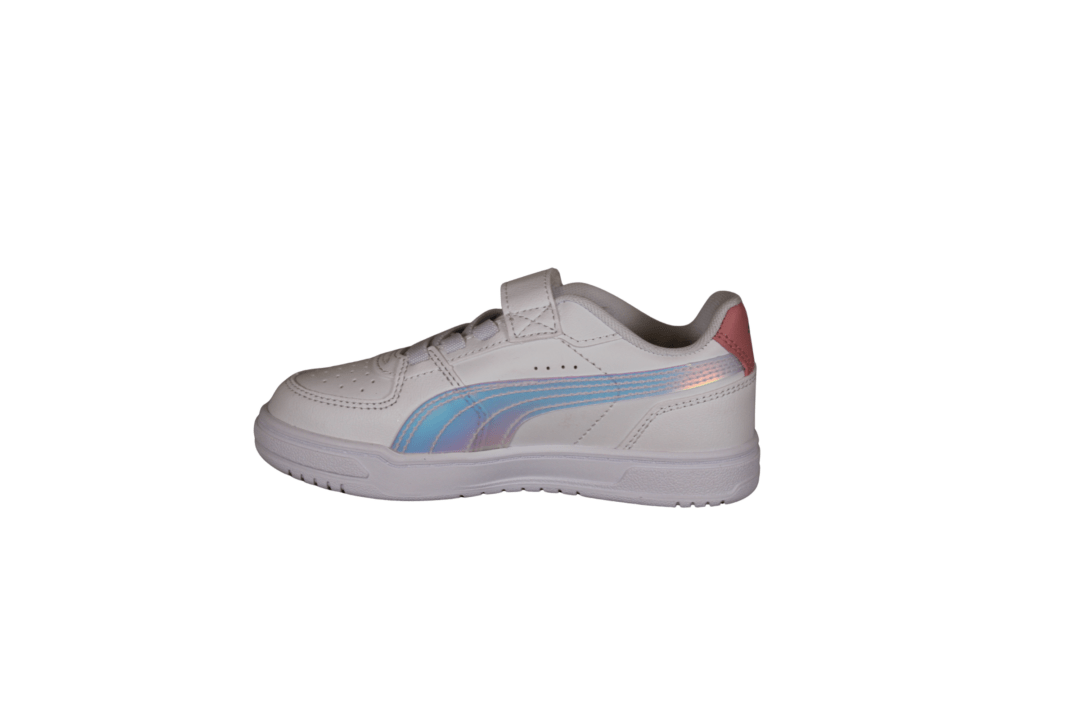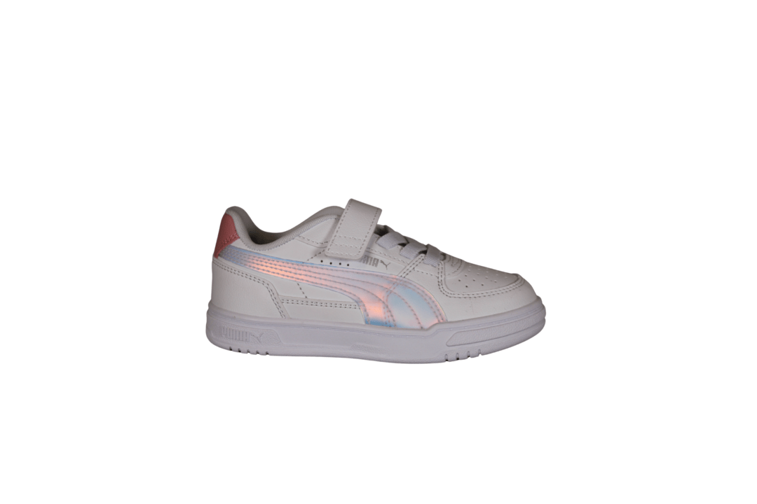 PUMA 406894 01 CAVENIII HOLO 2.0 AC +PS (741-3639). Hvid sneakers til pigerne med sølv stribe på ydersålen af skoen. Skoen har også en rosa detalje ved hælkappen. Materialet er vegansk materiale udvendig, og foret med tekstil indvendig. Nem at give på ved hjælp af velcrobåndet. Smart sneakers, hvis man skal pæn i byen.