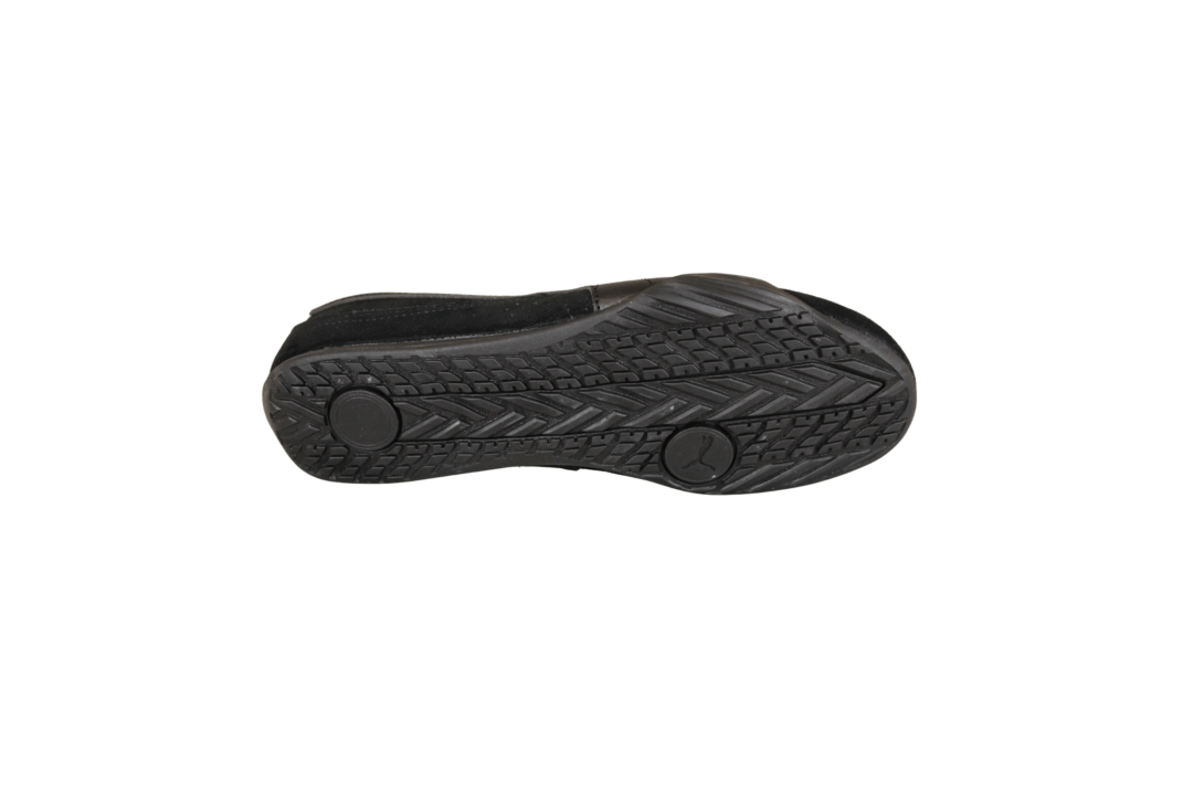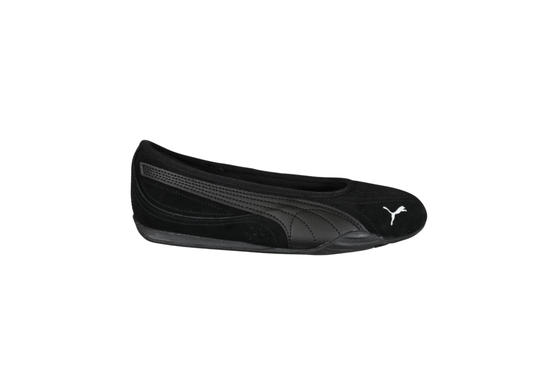 PUMA CATCH SOLEIL BALLERINA SD 406310-01 BLACK (031-571). Smart ballerina model fra PUMA med puma striben hen ad siden. Indvendig i hælkappen sidder der en polstring, som holder foden bedre på plads i modellen. Materialet er skind (nubuck) udvendig, og foret med tekstil indvendig. Ude i snuden af skoen er der et PUMA logo. Slidsålen er lavet i gummi.