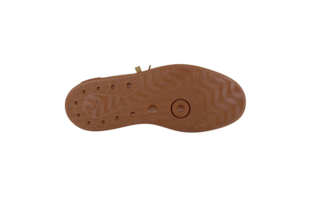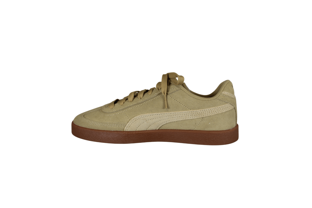 PUMA CLUB ERA SUEDE 400717 27 COFFEE MILK-SAND DUNE (741-3652). Smart lys beige sneakers med et grønligt skær og guld PUMA logo på siden og i hælen. Materialet udvendig er i skind (nubuck), og indvendig foret med tekstil. Indersålerne er med SoftFoam såler, så skoene er gode bløde at gå med. En meget let og fleksibel sneakers, der passer til det meste i garderoben.
