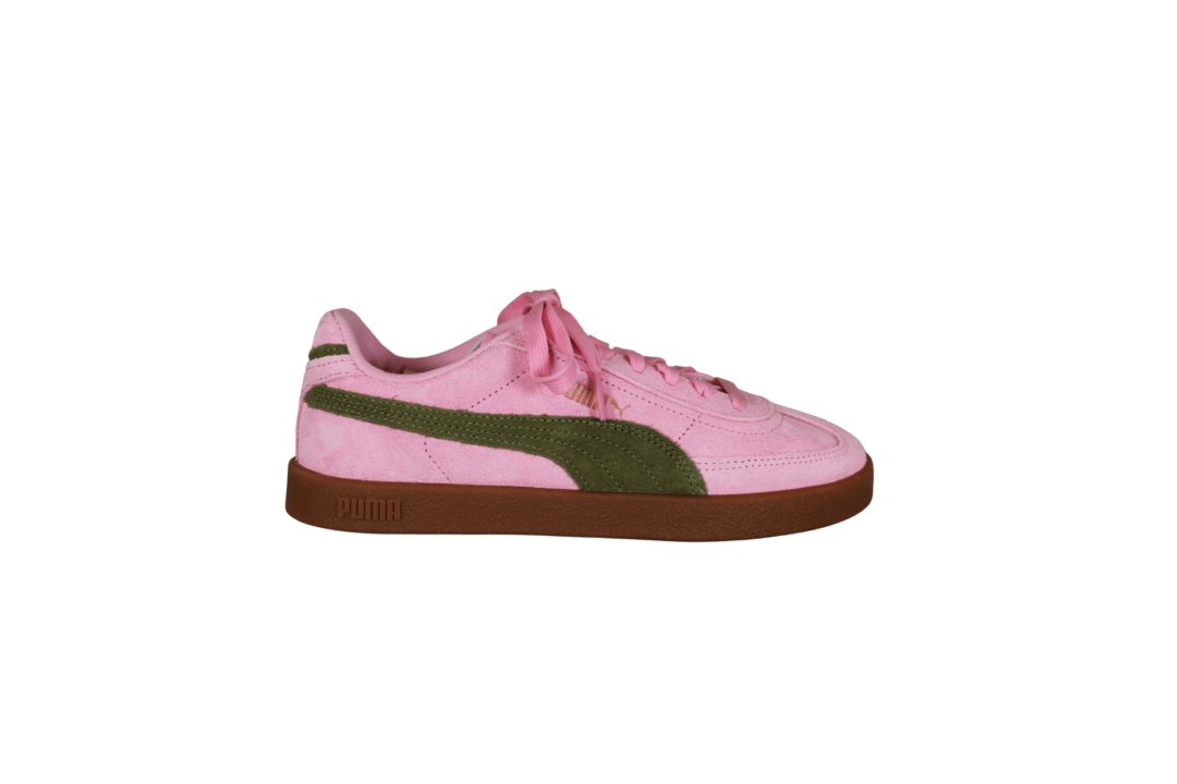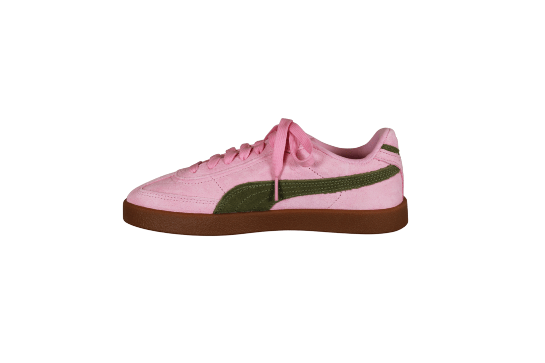 PUMA CLUB II ERA SUEDE 400717-31 PINK/OLIVE GREEN (741-3650). Smart pink sneakers med oliven grøn stribe og guld PUMA logo på siden og i hælen. Materialet udvendig er i skind (ruskind), og indvendig foret med tekstil. Indersålerne er med SoftFoam såler, så skoene er gode bløde at gå med. En meget let og fleksibel sneakers, der passer til det meste i garderoben.
